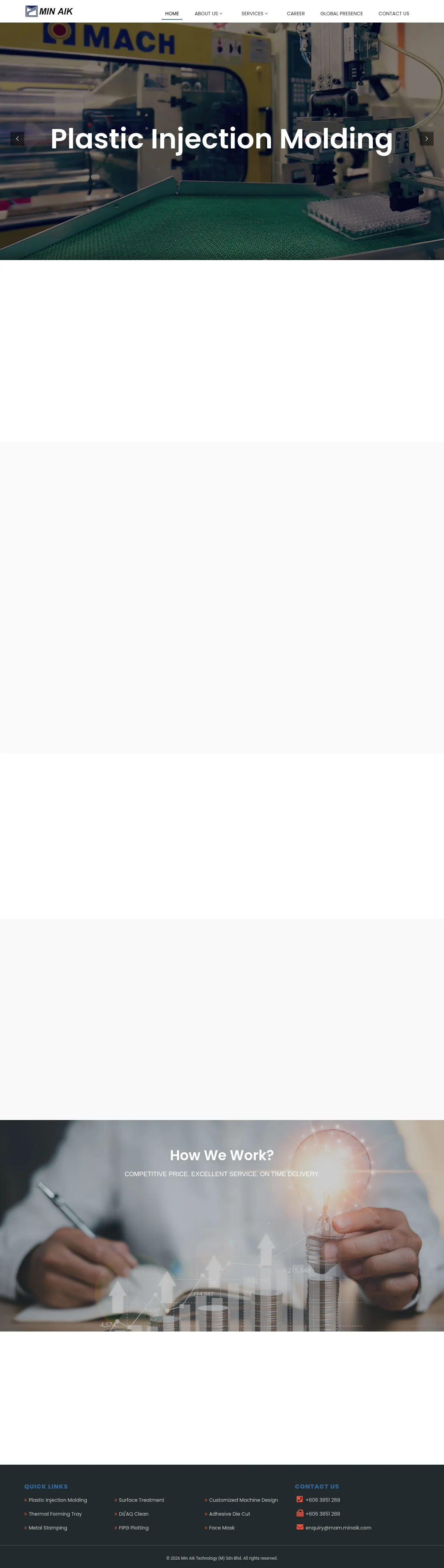 Min Aik Technology (M) Sdn Bhd is a diversified manufacturing partner providing vertically integrated OEM/ODM solutions. The company specializes in precision plastic injection molding, metal stamping, thermoforming, and advanced assembly services for the electronics, automotive, and medical industries. Their technical capabilities include automated Form-In-Place Gasket (FIPG) plotting, adhesive die-cutting, and surface treatment processes. Operating since 2000, the firm maintains cleanroom environments and high-precision production lines to support high-volume manufacturing. Min Aik is committed to responsible business practices and provides customized engineering solutions ranging from tool design to finished assembly.