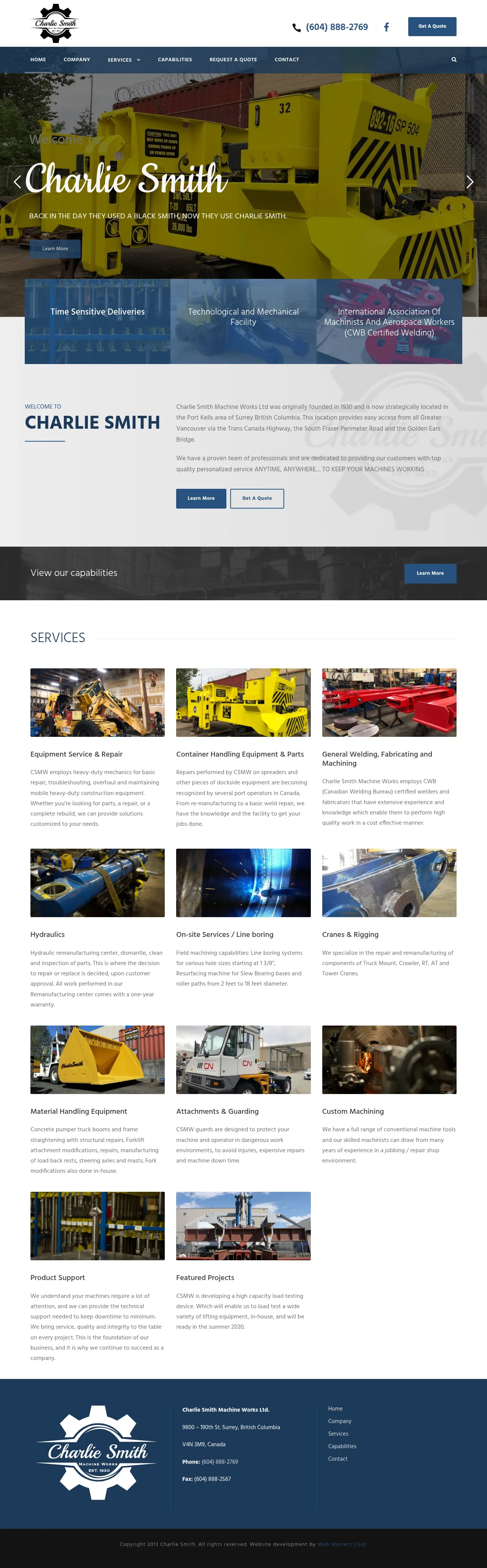 Charlie Smith Machine Works Ltd is a machine shop and fabricator based in the Port Kells area of Surrey, British Columbia. The company employs CWB-certified welders and experienced machinists to deliver welding, fabrication, custom machining, and parts for heavy-duty and container-handling equipment. Its 16,000 sq. ft. facility is equipped for repairs, overhauls and re-manufacturing, including overhead cranes and conventional machine tools. The shop provides time-sensitive and emergency services by arrangement.