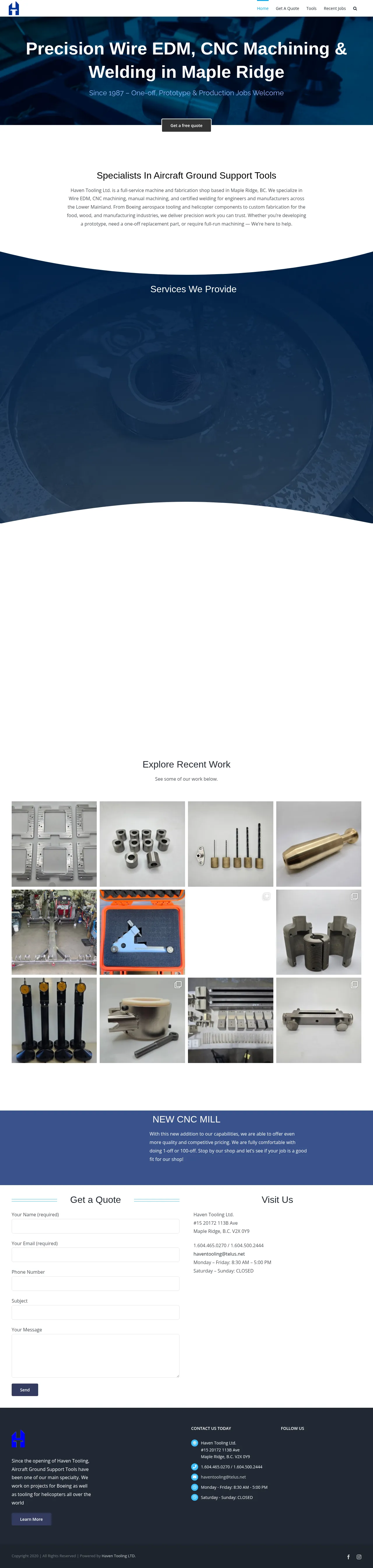 Haven Tooling Ltd. is a full-service machine and fabrication shop based in Maple Ridge, BC. The company provides CNC and manual machining, Wire EDM, and certified welding for aerospace and industrial customers. It specializes in aircraft ground support tooling for Boeing and helicopter components worldwide and supports prototypes, one-off replacements, and production runs.