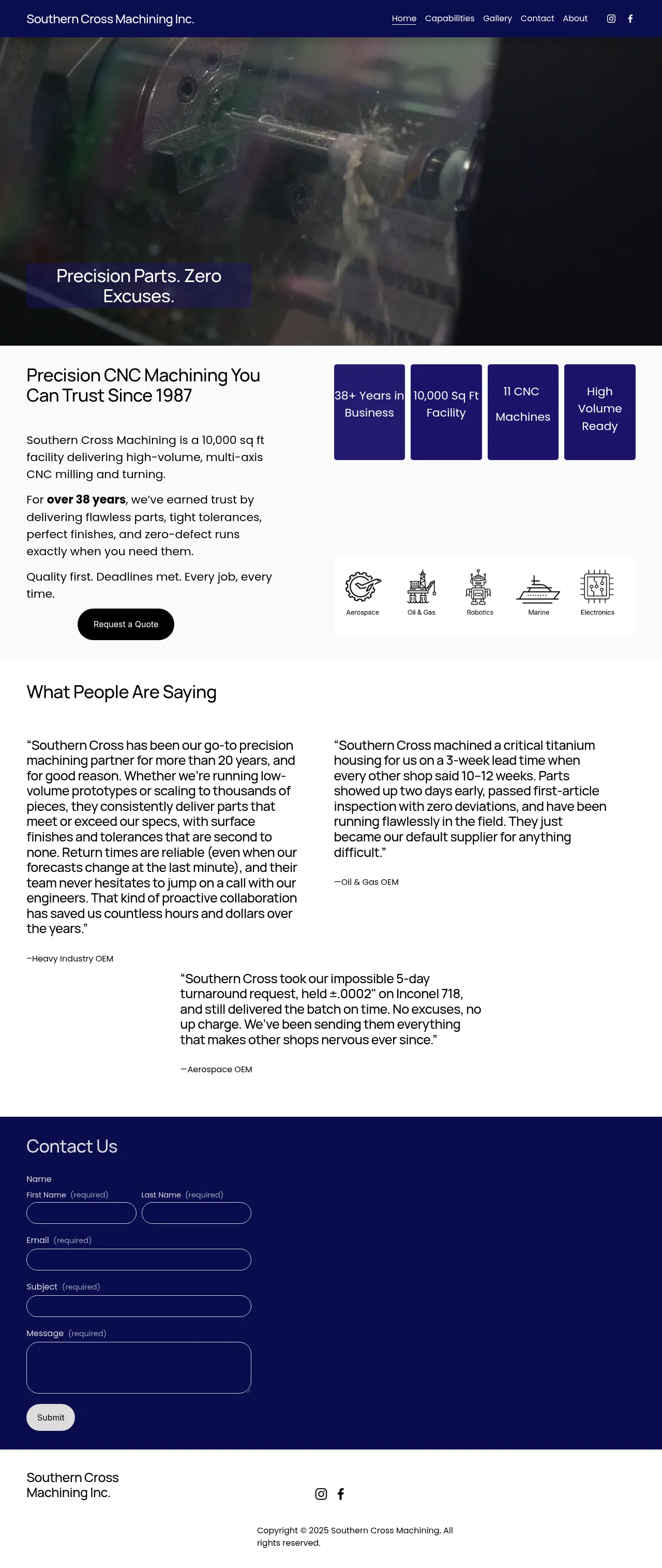 Southern Cross Machining Inc. is a precision CNC machine shop that manufactures tight-tolerance components for prototypes and production runs. Operating since 1987 from a 10,000 sq ft facility, the shop uses multi-task turn-mill centers and a dedicated milling department to complete complex parts in single setups. Work focuses on high surface-finish quality, repeatable tolerances and on-time deliveries for both short-lead and high-volume jobs.