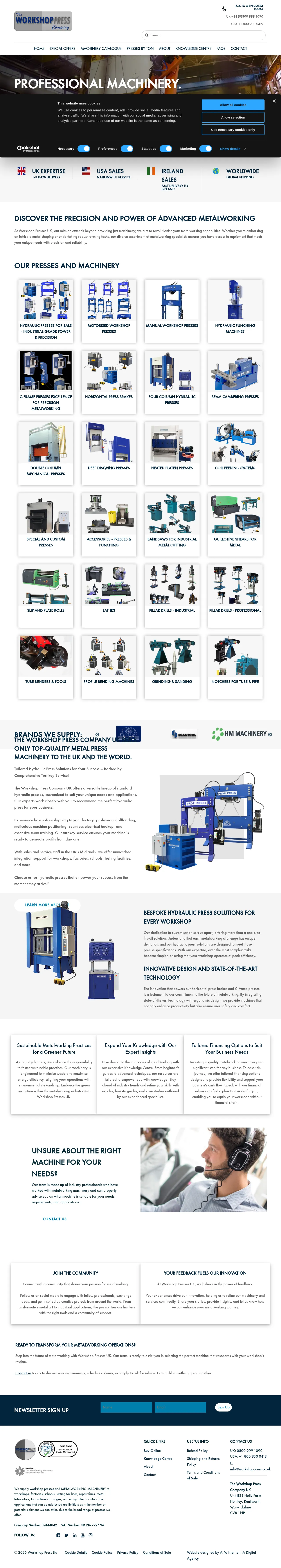 The Workshop Press Company UK specializes in the supply and distribution of industrial metalworking machinery and hydraulic presses. The company serves a diverse range of sectors including manufacturing, fabrication, educational facilities, and repair workshops. Their portfolio encompasses standard and custom hydraulic presses, ranging from 10 to 500 tons, alongside metal cutting and forming equipment. They provide comprehensive services including machine selection, turnkey installation, operator training, and ongoing maintenance. The firm operates with a commitment to precision engineering and sustainable manufacturing practices.