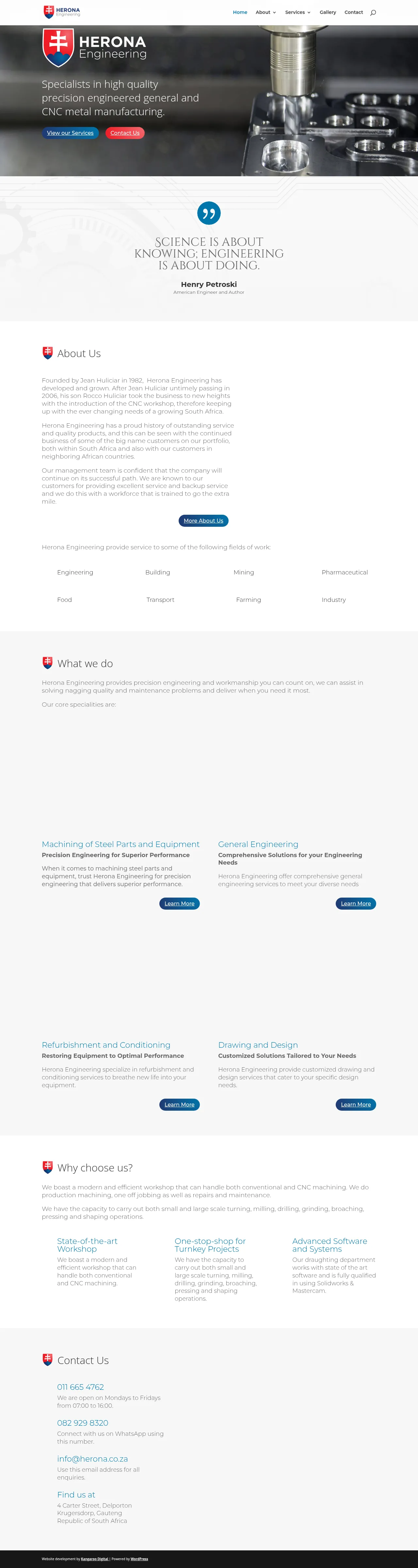 Herona Engineering is a precision engineering and metal manufacturing workshop offering CNC and conventional machining, refurbishment, and maintenance services. The company provides custom drawing and design support and undertakes production machining, one‑off jobs, and turnkey projects. It serves customers across South Africa and neighboring African countries and maintains a trained workforce to support ongoing service and backup.