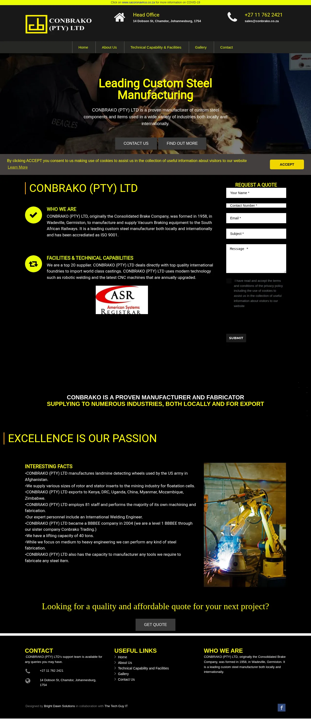 CONBRAKO (PTY) LTD is a South African custom steel manufacturer founded in 1958 to produce vacuum braking equipment for the national railways. The company supplies fabricated and machined components locally and for export, and sources precision castings from international foundries. It maintains in-house machining and fabrication capabilities and employs 81 staff. CONBRAKO is accredited to ISO 9001.