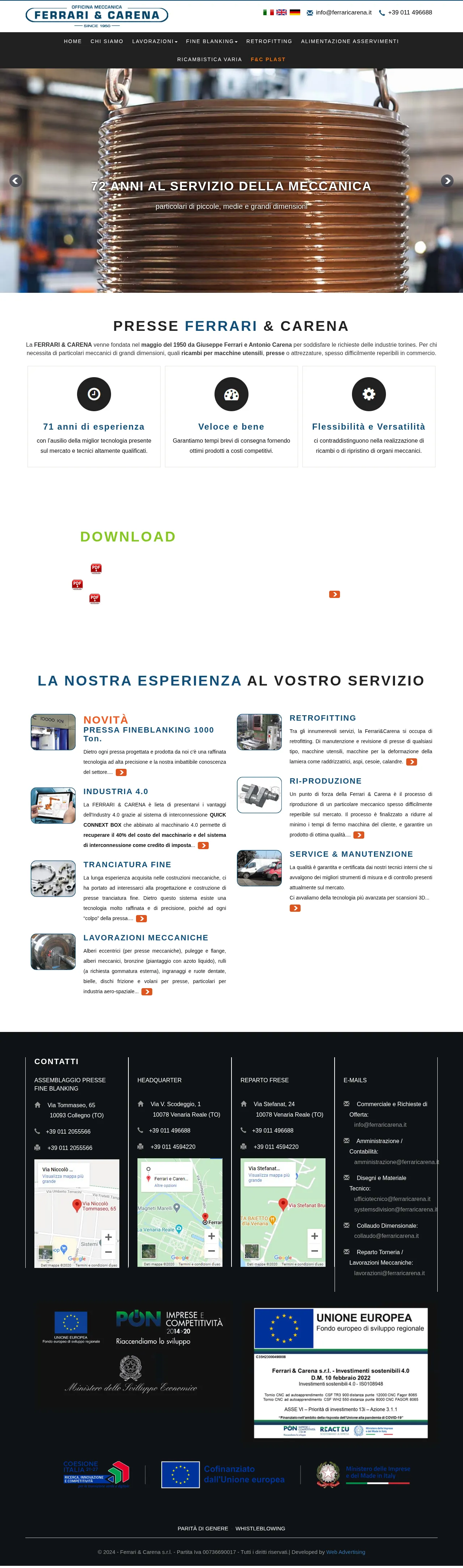 Founded in 1950, Ferrari & Carena specializes in precision mechanical engineering and the reproduction of mechanical components based on drawings or samples. The company serves a diverse range of industrial sectors by providing both small and large-scale components, including replacement parts for machine tools and presses. Their capabilities include fine blanking, mechanical machining, retrofitting, and specialized equipment assembly. Committed to quality and operational efficiency, they utilize advanced technology to deliver competitive, high-quality solutions with fast turnaround times. Furthermore, the company adheres to strict ethical standards and maintains a dedicated focus on gender equality and workplace inclusivity.