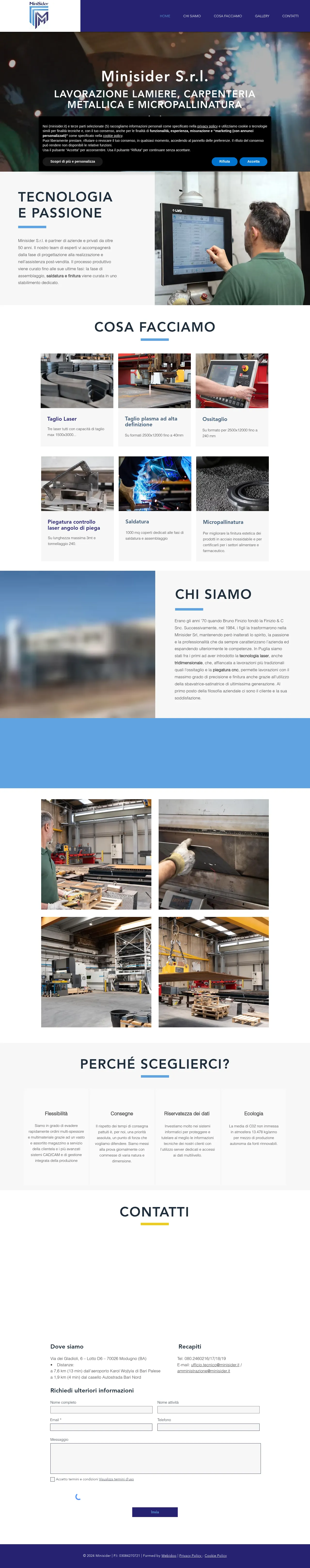 Minisider S.r.l. is a metalworking company based in Bari with more than 40–50 years of activity. It provides sheet‑metal processing, metal carpentry, welding, laser and plasma cutting, CNC bending and assembly. The company supports clients from design through production and post‑sale assistance and operates dedicated assembly facilities. It maintains a large stocked inventory and CAD/CAM production systems to handle multi‑thickness and multi‑material orders.