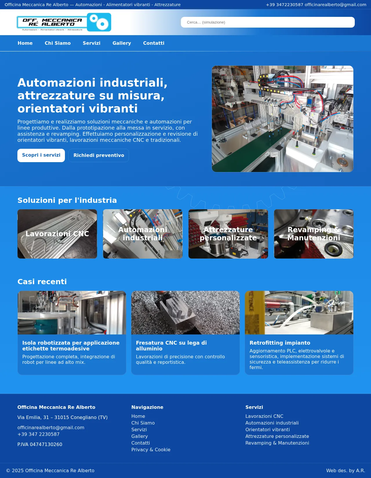 Officina Meccanica Re Alberto specializes in the design and manufacturing of custom industrial automation solutions and mechanical equipment. Their core expertise includes the development of vibratory feeders, robotic integration for production lines, and high-precision CNC machining. The company provides comprehensive lifecycle support, ranging from initial prototyping and commissioning to system upgrades and equipment revamping. They focus on optimizing manufacturing efficiency through PLC updates, safety system implementation, and remote maintenance services. Serving a diverse industrial base, they deliver tailored mechanical components and integrated systems to improve operational productivity.