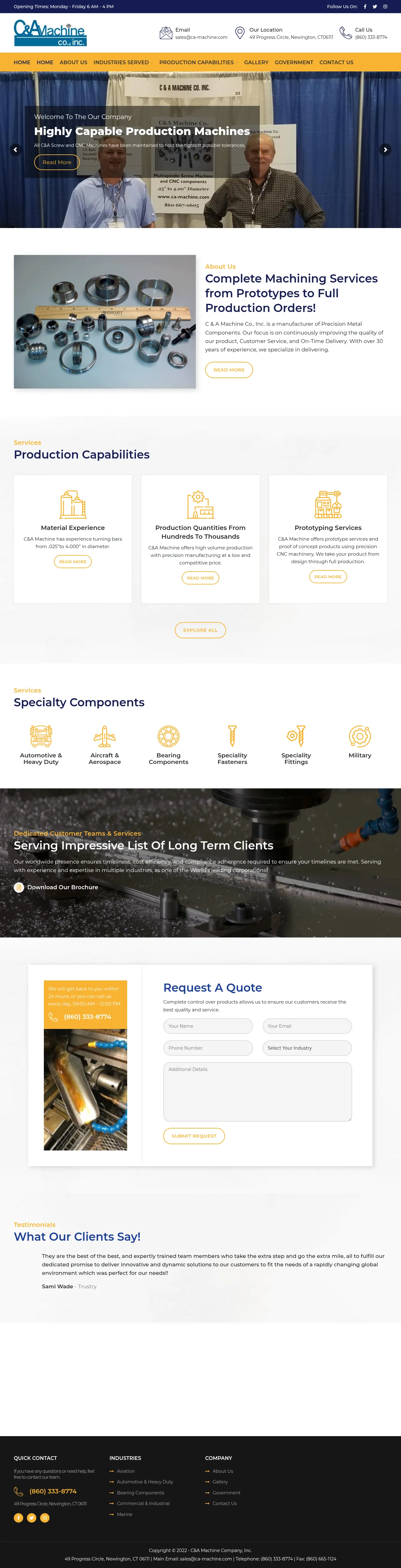 CA Machine specializes in precision CNC machining and screw machine services, supporting production volumes ranging from small-batch prototypes to high-volume manufacturing runs. The company serves a diverse set of sectors, including the aviation, marine, medical, military, and government industries. With a focus on quality control and manufacturing efficiency, the firm provides comprehensive production solutions. Their global presence supports clients with logistics and compliance requirements for international operations. The organization operates from its facility in Newington, Connecticut, maintaining strict oversight to ensure consistent product standards.
