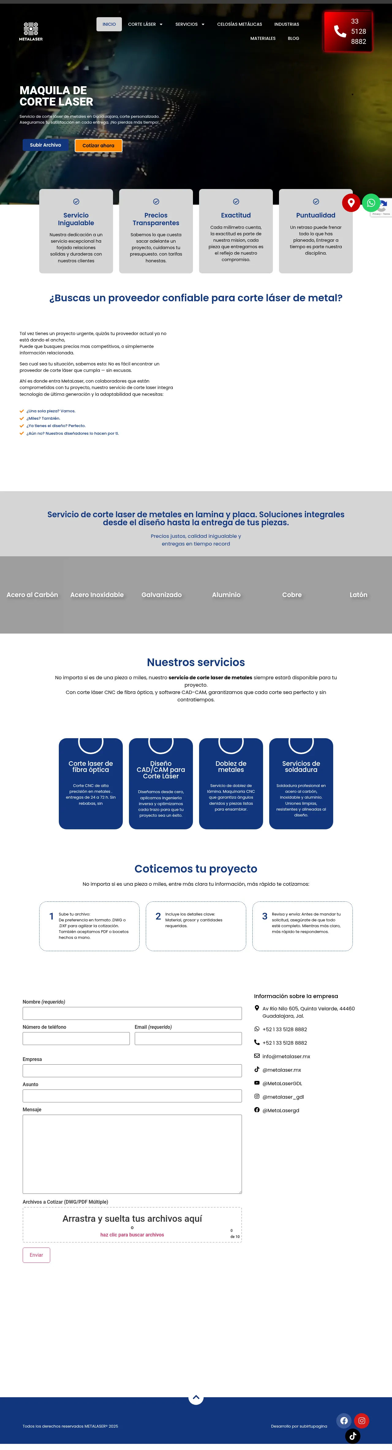 MetaLaser is a metal fabrication service provider based in Guadalajara, Mexico, specializing in precision fiber optic laser cutting. The company offers comprehensive metal processing solutions including CAD/CAM design, CNC bending, and professional welding services. They accommodate projects of all scales, ranging from single custom parts to high-volume production runs. Known for maintaining tight tolerances, the company emphasizes project delivery timelines and transparent pricing structures. Their service model supports clients from initial design stages through to final product assembly.