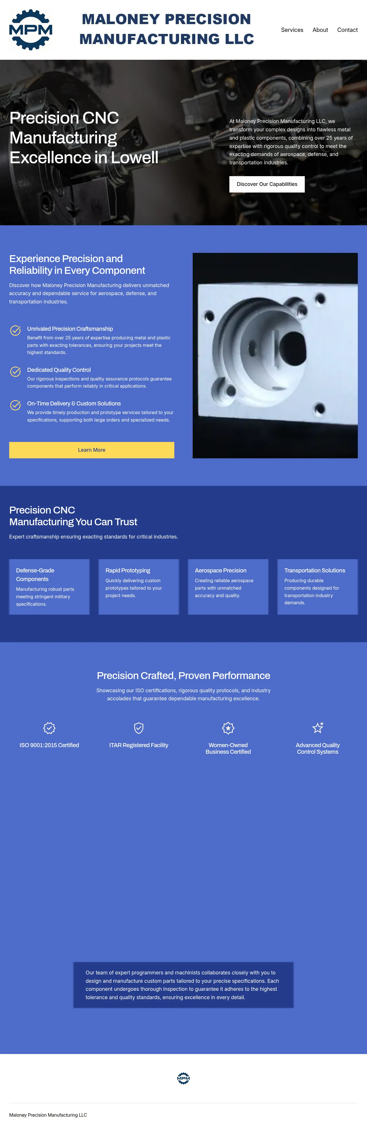 Maloney Precision Manufacturing LLC is a contract manufacturer specializing in the production of complex metal and plastic components. With over 25 years of industry experience, the company serves the aerospace, defense, and transportation sectors. Their capabilities include precision CNC machining, rapid prototyping, and the production of parts built to rigorous military specifications. The firm emphasizes quality assurance through comprehensive inspection protocols and adherence to demanding technical tolerances. They provide end-to-end support for both custom prototypes and large-scale manufacturing projects.