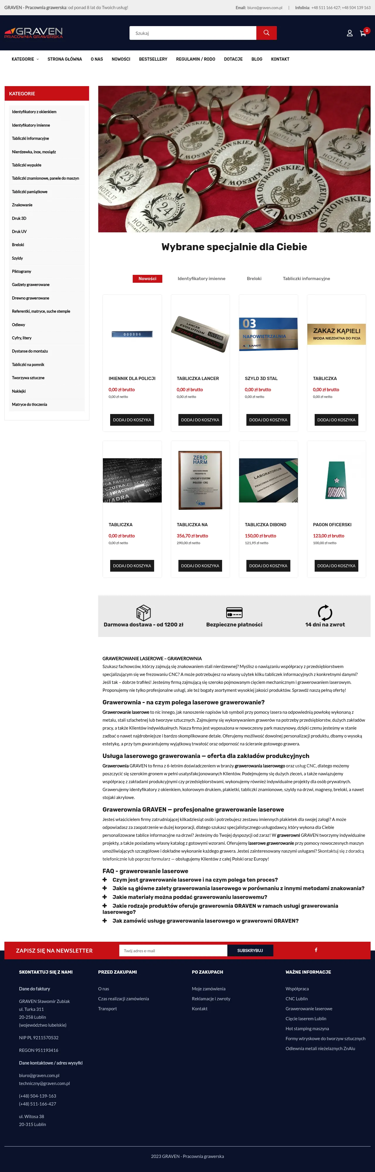 Pracownia Grawerska GRAVEN is a Lublin-based workshop specializing in laser engraving and mechanical cutting with six years of experience. The company offers laser marking on metals and plastics, CNC milling services, and manufactures custom signs, nameplates, badges, keyrings and acrylic displays. GRAVEN serves both individual clients and industrial customers across Poland and Europe and operates a modern machine park for detailed, durable personalization.