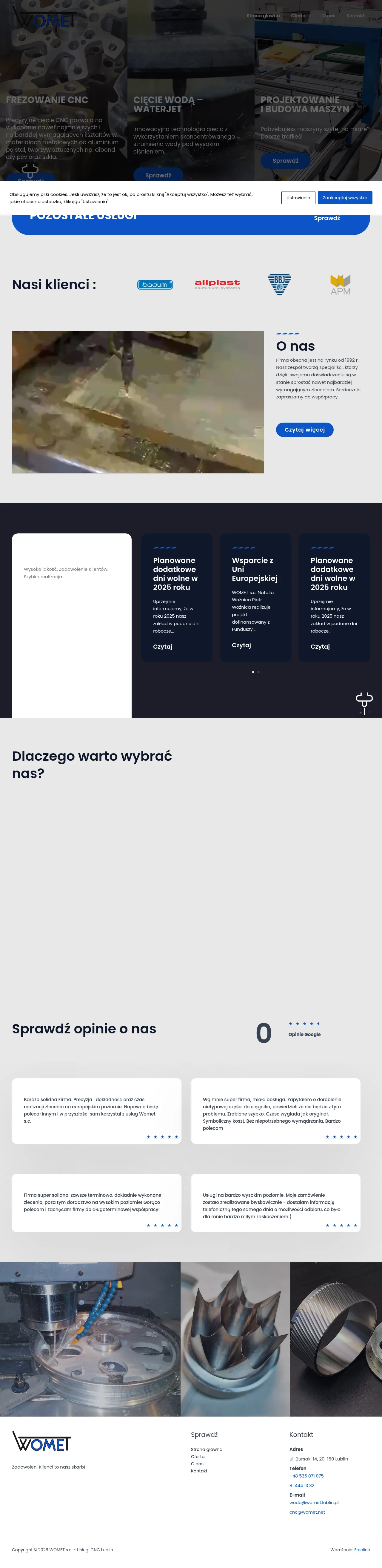 WOMET s.c. is a metalworking and machine-building company established in 1992, offering CNC milling, waterjet cutting, conventional turning and custom machine design and construction. The company supplies precision machining, tooling and fixtures, and performs secondary processes such as sawing, sheet bending and welding. Projects range from small locksmith work to larger industrial orders, including injection molds, punches and bespoke metal structures.