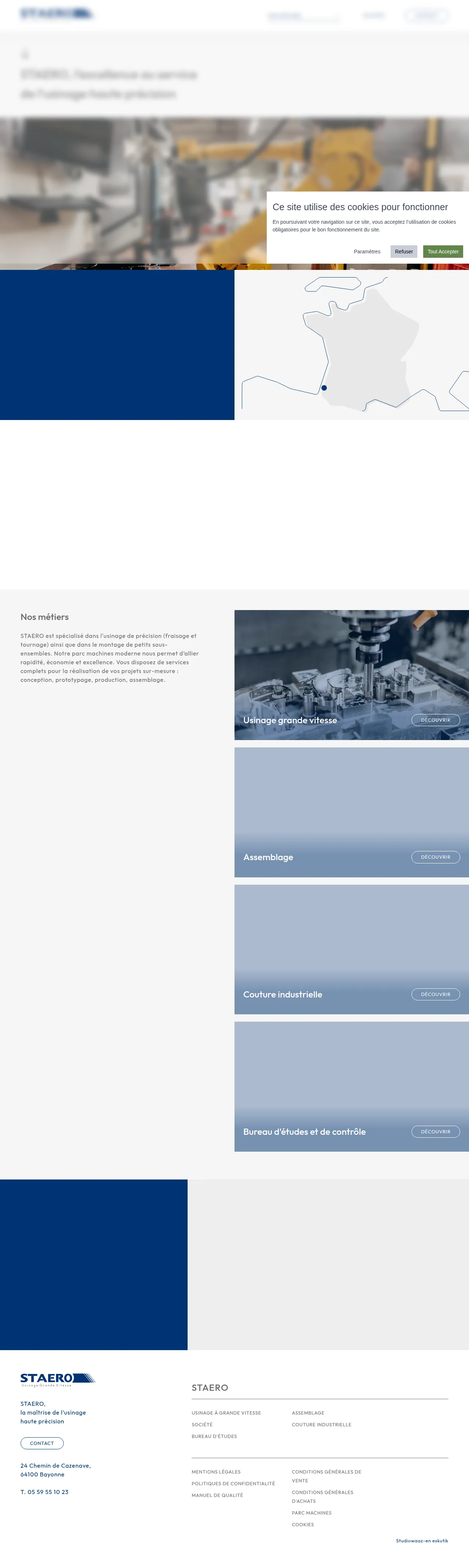STAERO is a precision machining company based in Bayonne, France, specializing in high-speed 5-axis machining for the aerospace, defense, and marine industries. With over three decades of experience, the company provides comprehensive manufacturing solutions ranging from initial design and prototyping to full-scale production. Their capabilities include complex milling, turning, boring, honing, and mechanical assembly. STAERO serves as a Tier 1 supplier for civil and military aviation projects, emphasizing high-precision standards and technical reliability. The facility operates with advanced automation and robotic systems to maintain efficiency for both small and large-scale series.
