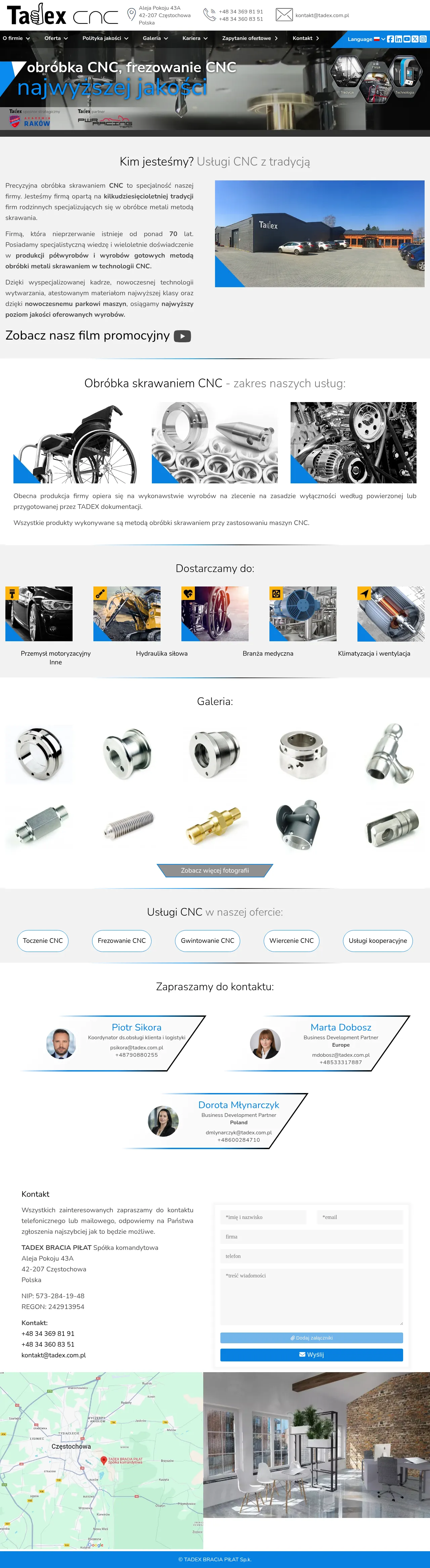 Tadex Bracia Piłat Sp.k. specializes in precision metal machining services using advanced CNC technology. The company produces a wide array of semi-finished and finished components for sectors including automotive, medical, power hydraulics, and industrial ventilation. Their technical capabilities span CNC milling, turning, drilling, and threading, with the ability to process parts from various materials such as steel, aluminum, and brass. The company is committed to maintaining quality standards through a comprehensive measurement laboratory and follows strict production timelines to ensure operational efficiency for their clients. Tadex provides tailored manufacturing solutions based on provided technical documentation or custom designs.
