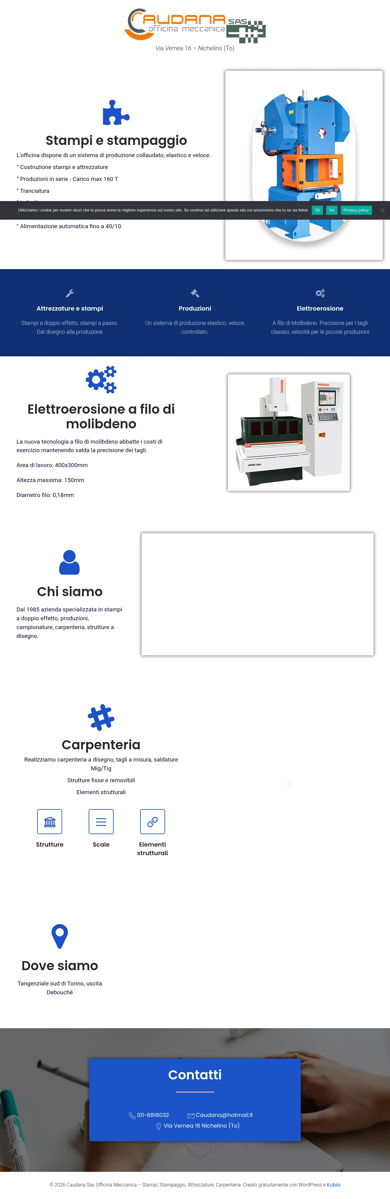 Caudana Sas Officina Meccanica is a mechanical engineering firm based in Nichelino, Italy, specializing in the design and production of industrial molds and stamping tools. The company provides a comprehensive range of metalworking services, including precision machining, mechanical carpentry, and electrical discharge machining. They serve a diverse client base by leveraging technical expertise to deliver custom tooling and component manufacturing solutions. With a focus on accuracy and mechanical reliability, the firm supports various industrial manufacturing processes. The business maintains a dedicated facility equipped to handle complex metal fabrication and assembly requirements.