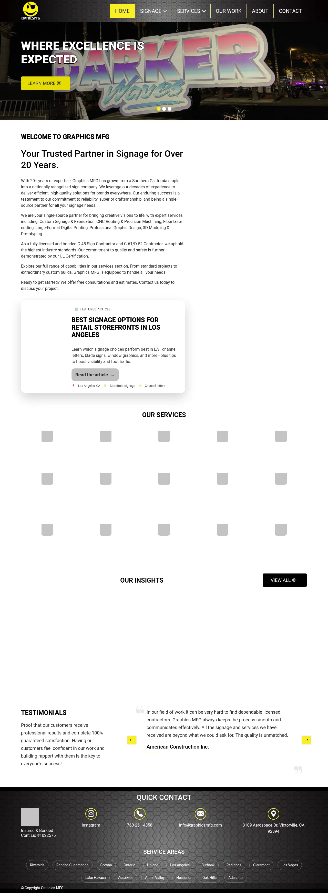 Graphics MFG is a full-service custom signage and fabrication company that manages projects from initial concept through to final installation. The firm serves a diverse range of clients, including retail businesses, design firms, and contractors, providing solutions such as channel letters, monument signs, ADA-compliant signage, and large-format printing. Their facility is equipped for advanced design, manufacturing, and electrical services, ensuring that all products meet local building codes and safety standards. Beyond fabrication, the company offers expert assistance with permitting, site evaluations, and LED retrofitting to enhance brand visibility. Graphics MFG emphasizes a start-to-finish approach, leveraging over two decades of industry experience to deliver durable and professional custom graphics.