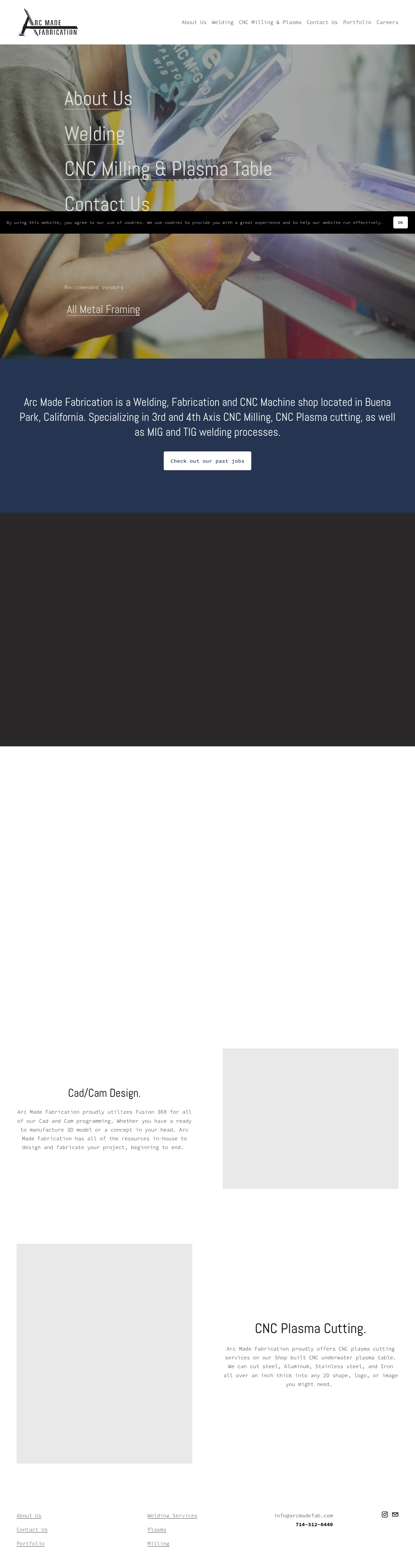 Arc Made Fabrication is a full-service metal fabrication and CNC machine shop located in Buena Park, California. The company specializes in 3rd and 4th axis CNC milling, CNC plasma cutting, and high-precision MIG and TIG welding. In addition to in-house shop production, they provide on-site welding services for diverse applications. Using Fusion 360 for CAD/CAM programming, the shop handles projects from initial concept design through to final manufacturing. They serve a broad range of clients requiring custom metal fabrication, structural components, and precision machine parts.