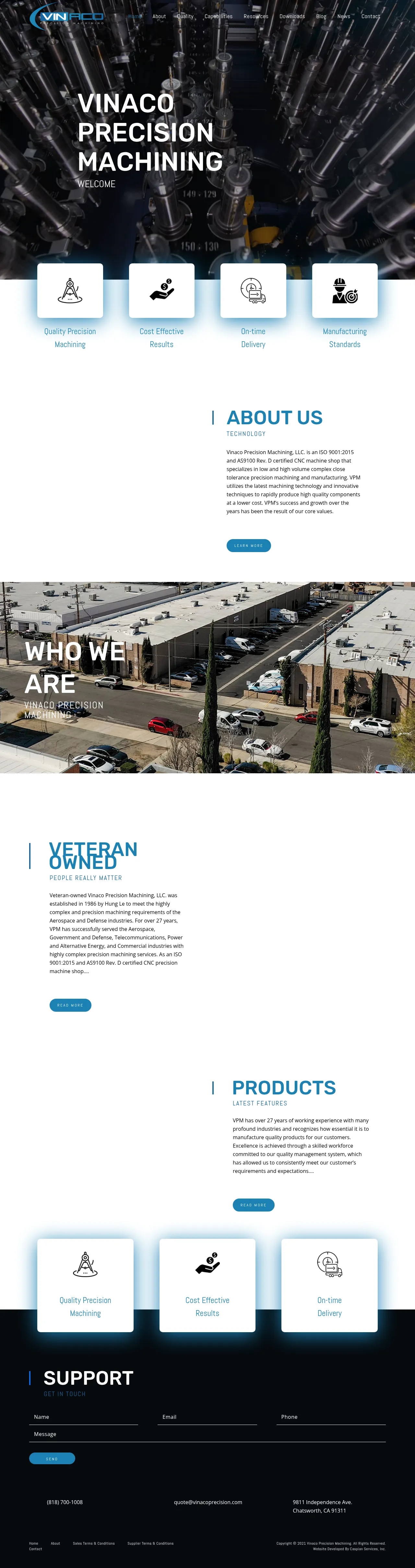 Vinaco Precision Machining, LLC. is a veteran-owned CNC machine shop providing complex, close-tolerance precision machining services. Since 1986, the company has supported the aerospace, defense, telecommunications, power, and commercial industries with both low and high-volume production. Their facility utilizes climate-controlled environments and advanced machining technology to achieve high-precision specifications. The company emphasizes quality through a robust management system and a focus on continuous improvement. Their service offerings include various secondary processes such as plating, heat treating, and grinding.