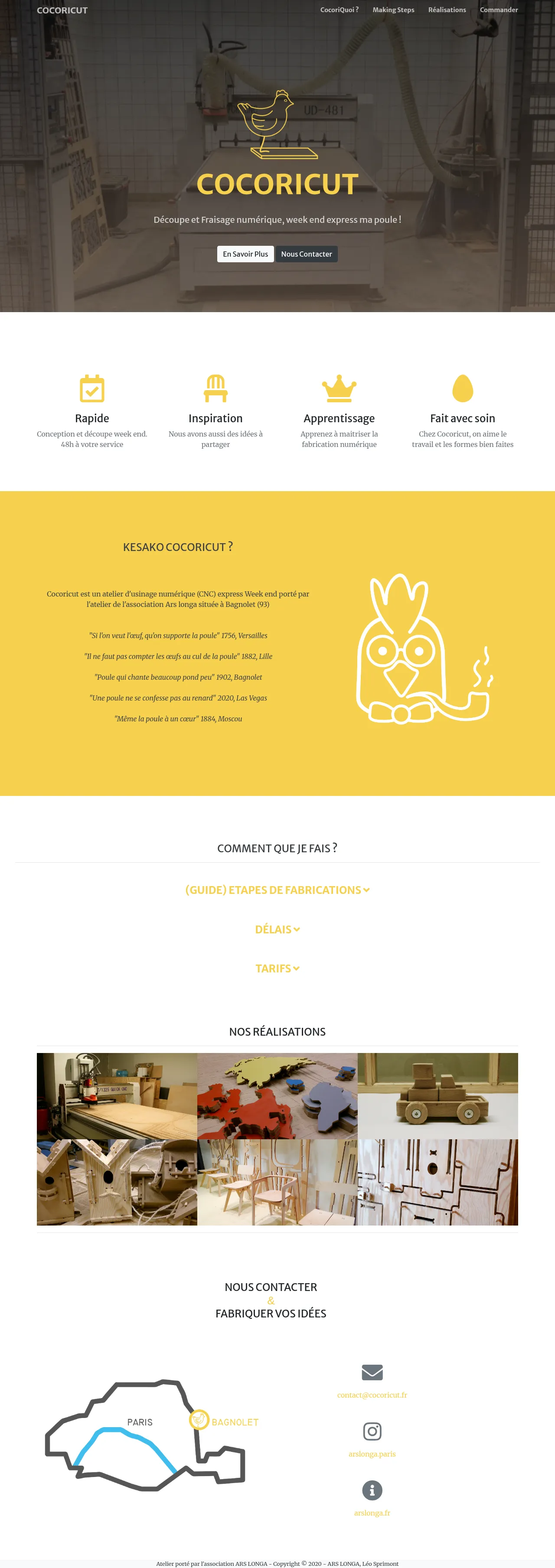 Cocoricut is a specialized CNC machining workshop located in Bagnolet, France, operating under the Ars Longa association. The company provides express digital milling and cutting services, with a specific focus on weekend turnaround capabilities. Their primary service model centers on 48-hour project completion for a diverse range of technical and creative applications. Cocoricut works directly with client-provided digital design files to ensure precision in material processing. They offer flexible production support suitable for custom manufacturing needs, catering to professional designers and hobbyists alike.