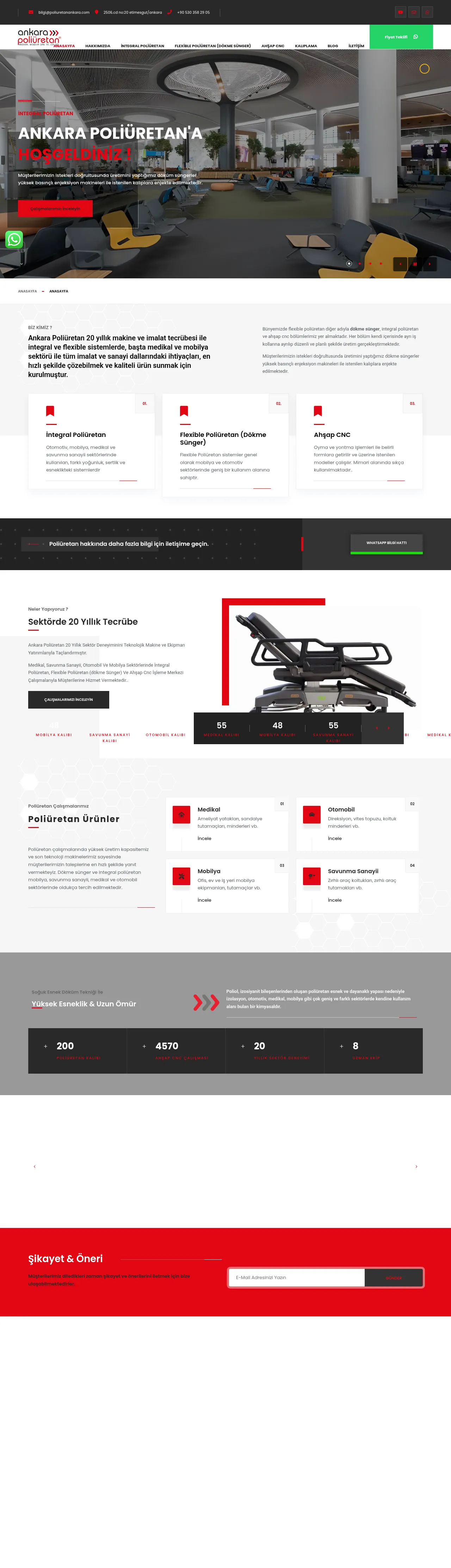 Ankara Poliüretan provides specialized manufacturing services leveraging over 20 years of experience in the industry. The company focuses on the production of integral and flexible polyurethane components, alongside wood CNC machining services. They serve a diverse client base across the medical, automotive, furniture, and defense sectors. By utilizing high-pressure injection molding technology and precision CNC systems, the company offers custom solutions for complex geometric parts. Their operations are characterized by organized, plan-driven manufacturing workflows designed to meet specific technical requirements efficiently.