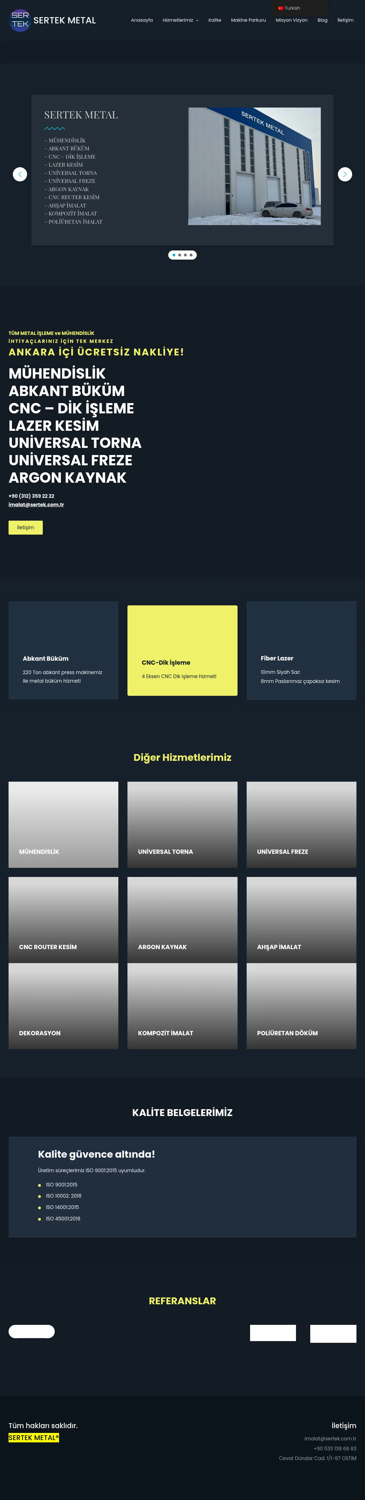 Sertek Metal is an industrial manufacturing company specializing in precision metal processing and engineering solutions. The company provides a comprehensive range of services including CNC machining, fiber laser cutting, press brake bending, and various welding techniques. Their facility supports diverse manufacturing needs such as wood and composite production, polyurethane casting, and general decoration fabrication. Committed to quality standards, they operate under international quality management certifications to ensure high precision in every project. Based in Ankara, Sertek Metal offers efficient, high-quality production services with local logistical advantages.