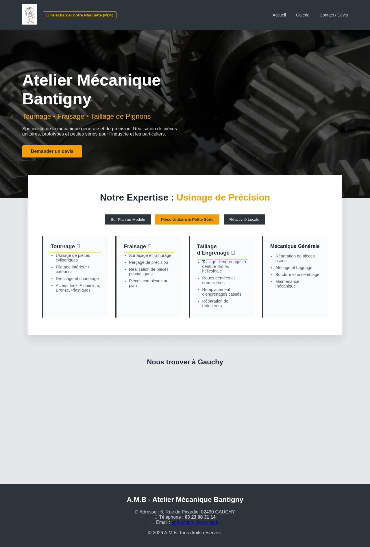 Atelier Mécanique Bantigny is a specialized precision and general machining workshop based in Gauchy, France. The company provides manufacturing solutions for industrial clients and individual customers, focusing on the production of single units, prototypes, and small-batch series. Their technical capabilities span turning, milling, gear cutting, welding, and mechanical maintenance. All work is conducted according to client specifications, whether based on detailed technical drawings or existing physical models. The company distinguishes itself through its local responsiveness and expert approach to mechanical assembly and complex machining tasks.