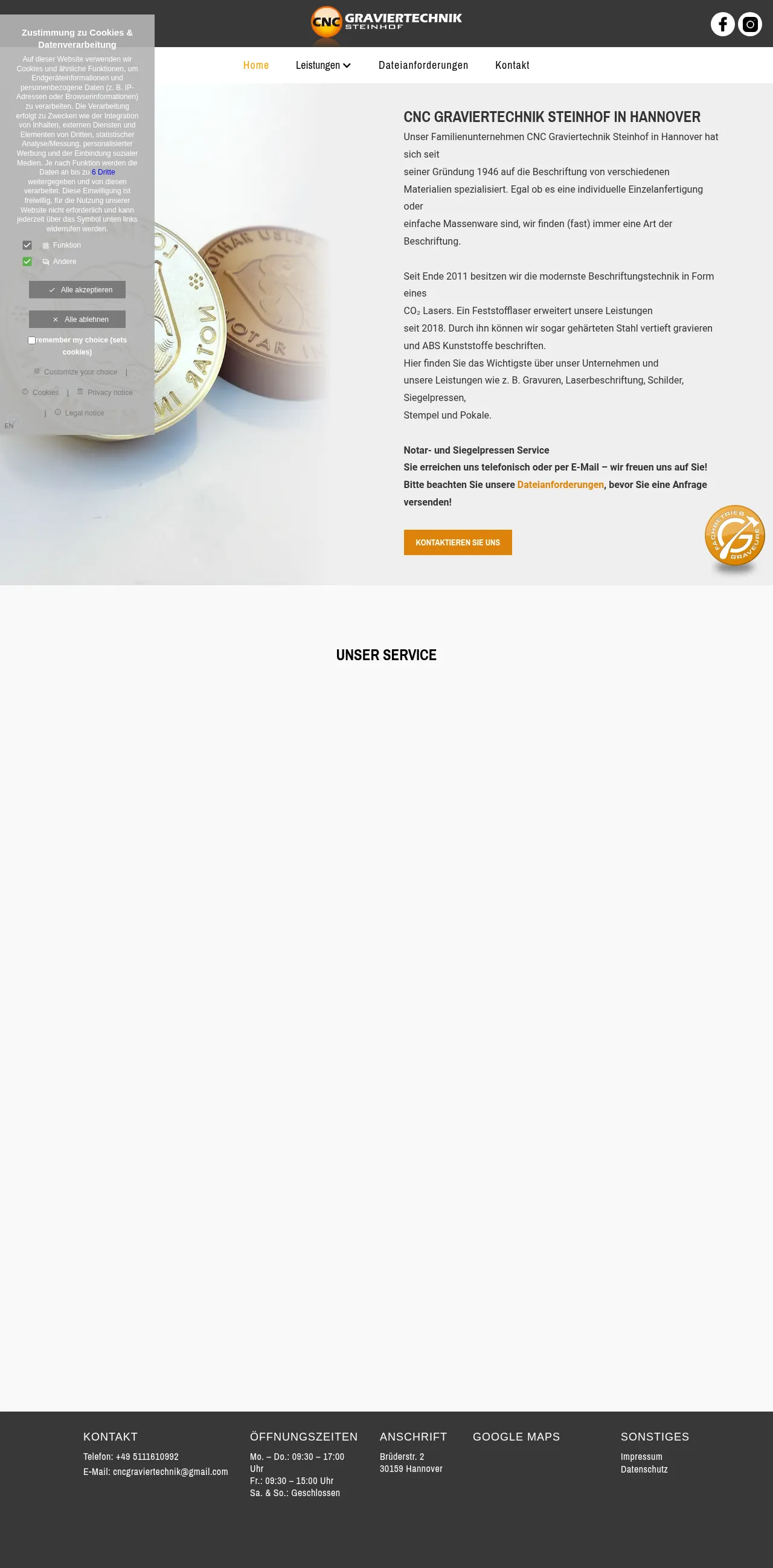 CNC Graviertechnik Steinhof is a specialized manufacturing company based in Hannover, Germany, focused on precision engraving and labeling solutions. Their service portfolio encompasses the production of bespoke signage, custom awards, trophies, and medals, as well as the creation of specialized seals and stamping tools. The company also provides advanced LED illumination systems suitable for both interior and exterior environments. Additionally, they offer technical marking services on various surfaces, including glass, and provide professional maintenance for notary and seal presses. The firm serves diverse client needs with a focus on custom fabrication and precise material processing.