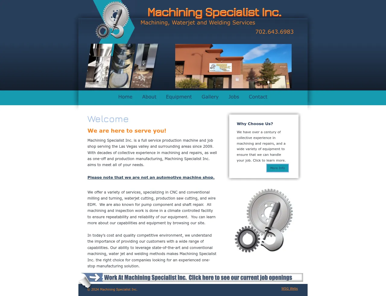 Machining Specialist Inc. is a full‑service production machine and job shop serving the Las Vegas Valley and surrounding areas since 2009. The company provides CNC and conventional milling and turning, waterjet cutting, wire EDM, welding, and production saw cutting for one‑off and production work. It also specializes in pump component and shaft repair and performs machining and inspection in a climate‑controlled facility.