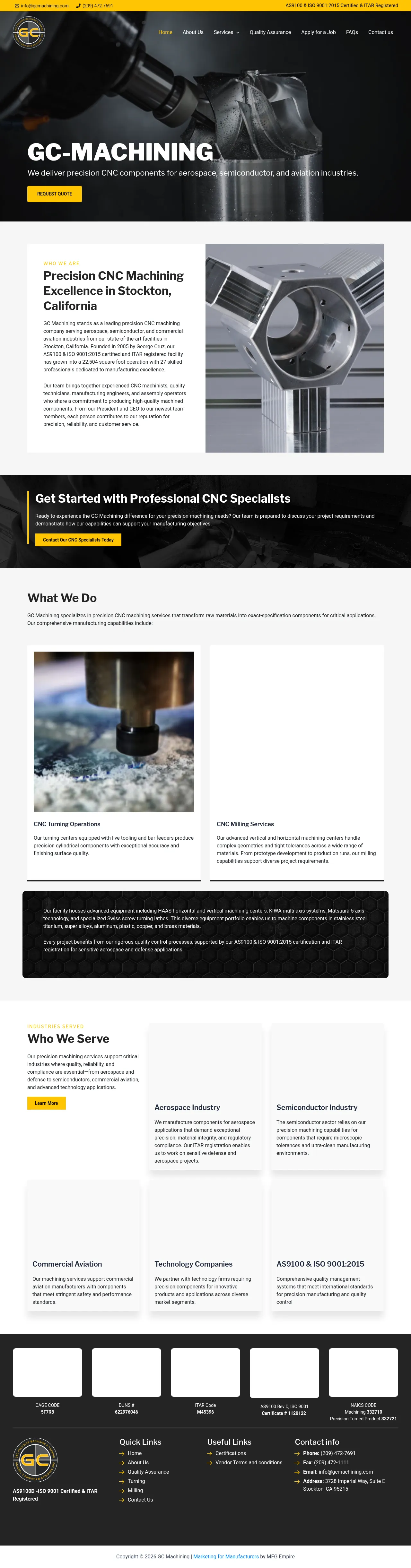 GC Machining is a precision CNC machining provider based in Stockton, California, supplying components for aerospace, semiconductor, and commercial aviation customers. The company converts raw materials into tight-tolerance parts using turning centers, vertical and horizontal machining centers, multi-axis/5-axis systems, and Swiss screw lathes. GC Machining supports prototype development through production runs and maintains quality practices for regulated aerospace and defense work.