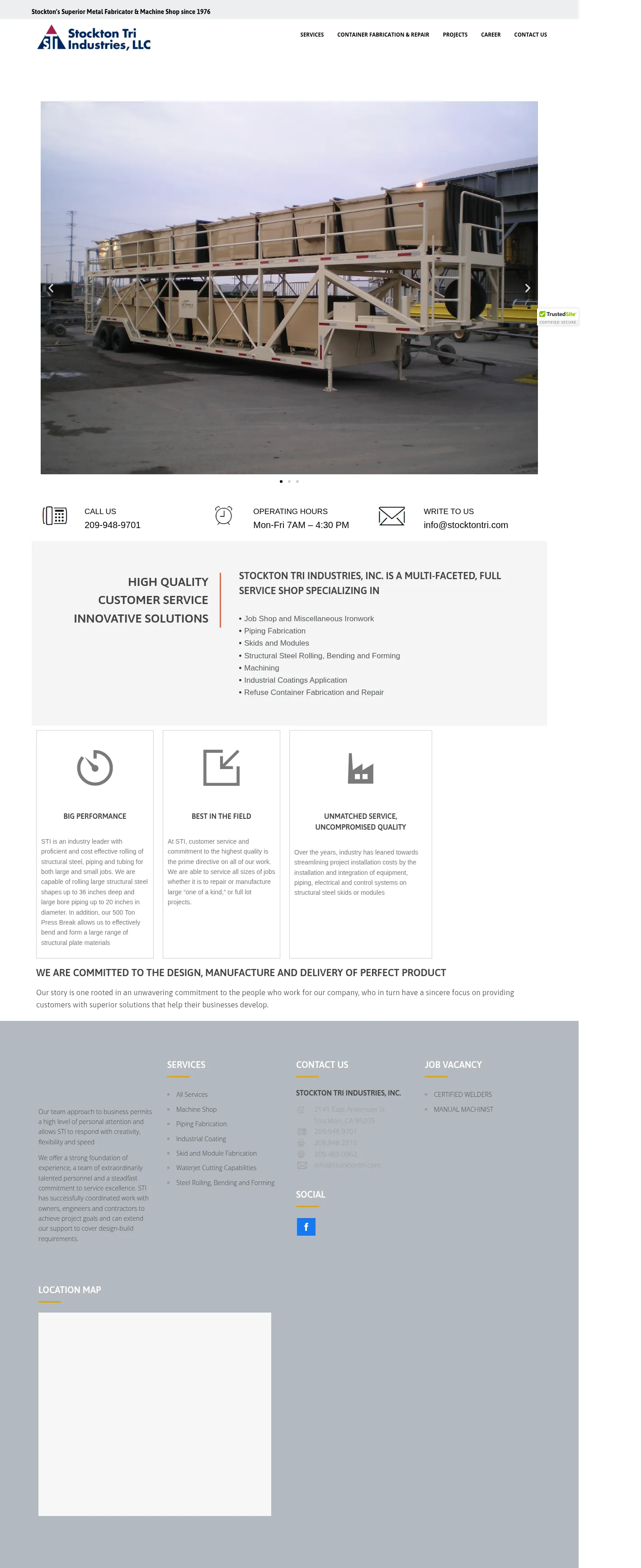 Stockton Tri Industries, Inc. is a full-service metal fabrication and repair shop specializing in machining, piping, structural steel work, and container fabrication. The company provides container repair, refurbishment and retrofit services, skid and module fabrication, and industrial coating application. Stockton Tri Industries works with owners, engineers and contractors and can support design-build project requirements.