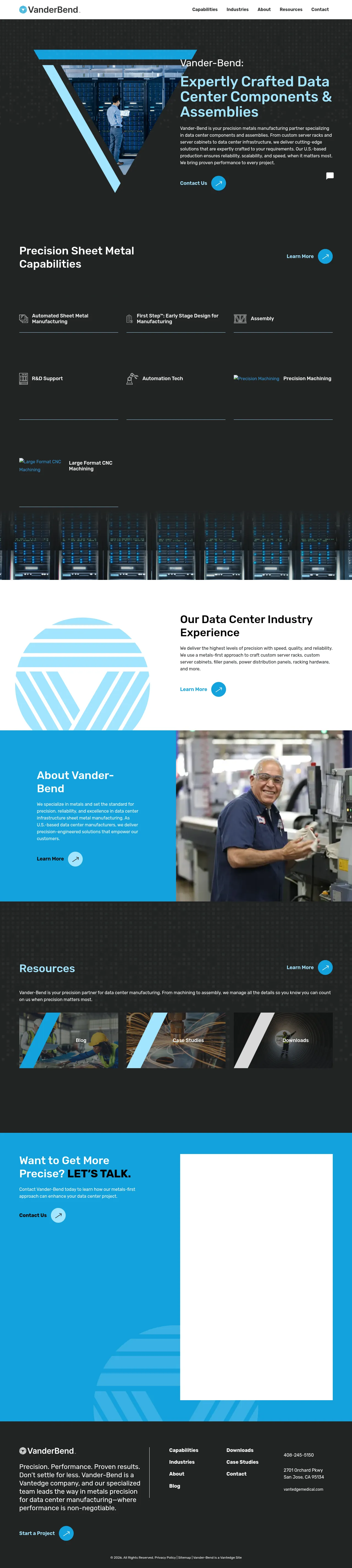 Vander-Bend is a U.S.-based precision metals manufacturer specializing in automated sheet metal fabrication and assemblies for data center infrastructure. The company provides machining, large-format CNC capabilities, and mechanical and electromechanical assembly services for custom server racks, cabinets, panels, and related components. Vander-Bend operates automated production in the United States and ships globally to support prototype through volume manufacturing.
