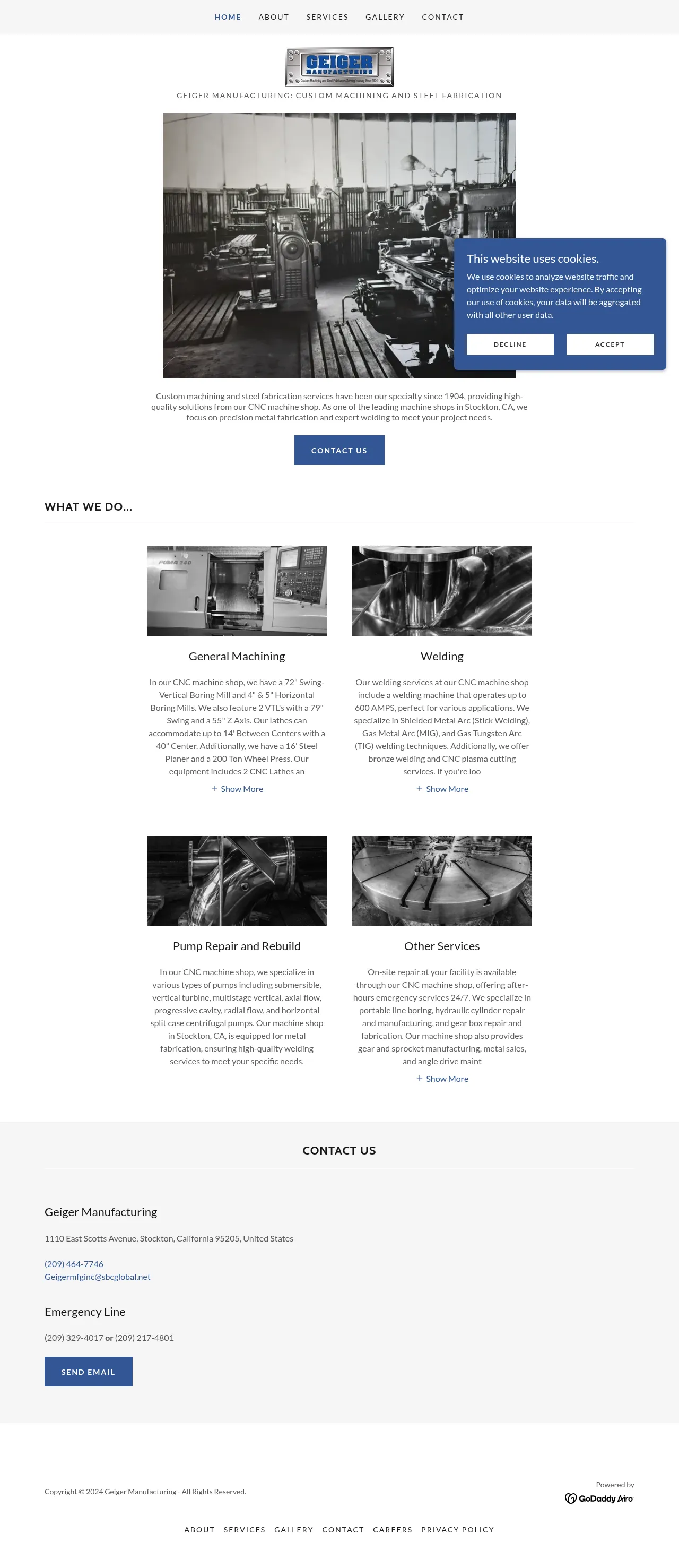 Geiger Manufacturing is a CNC machine shop in Stockton, California that provides custom machining, precision steel fabrication, and welding services. Founded in 1904, the company offers turnkey manufacturing including design, prototyping, assembly, cutting, forming, repairs, and logistics for customers across multiple industries. It also provides specialized repair services such as pump rebuilding, portable line boring, hydraulic cylinder and gearbox repair, and on-site emergency work.