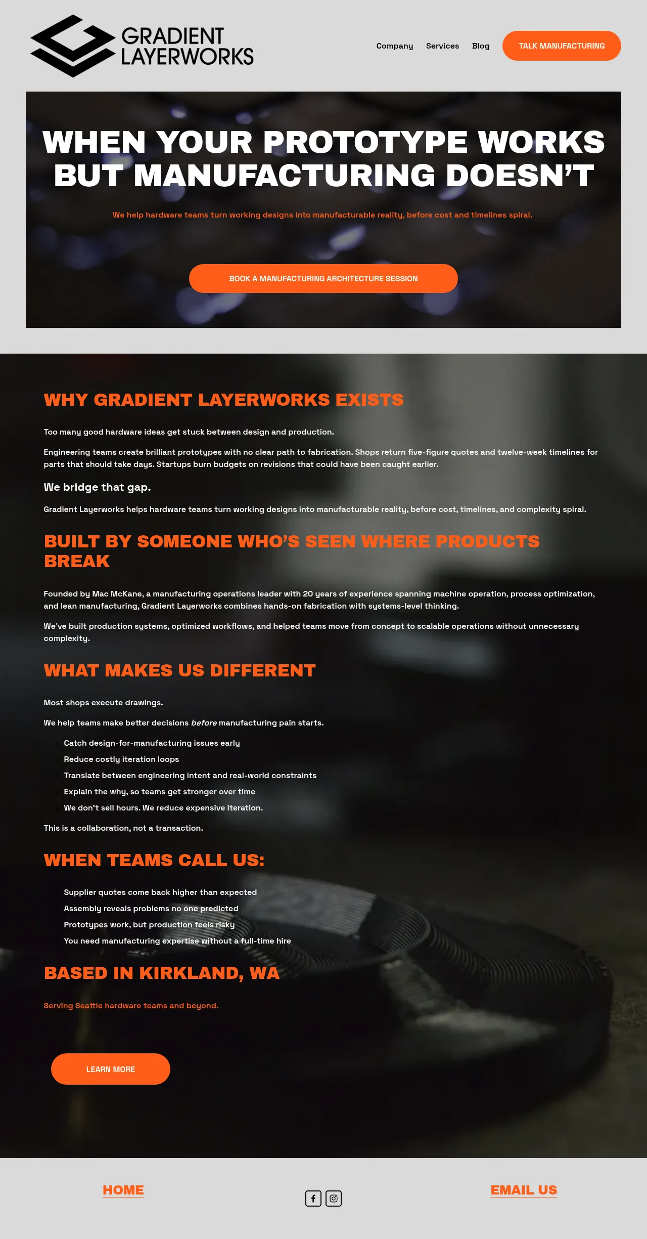 Gradient Layerworks provides specialized manufacturing consulting services to hardware startups and engineering teams. The firm assists clients in bridging the gap between prototype design and scalable production to reduce manufacturing costs and lead times. Core capabilities include design-for-manufacturing analysis, manufacturing systems support, and professional architecture sessions to identify and mitigate production risks early in the development cycle. By combining hands-on fabrication experience with Lean Six Sigma methodologies, the company helps technical teams align their designs with real-world production constraints. Based in Kirkland, Washington, the firm focuses on improving operational efficiency for product teams preparing for market entry.