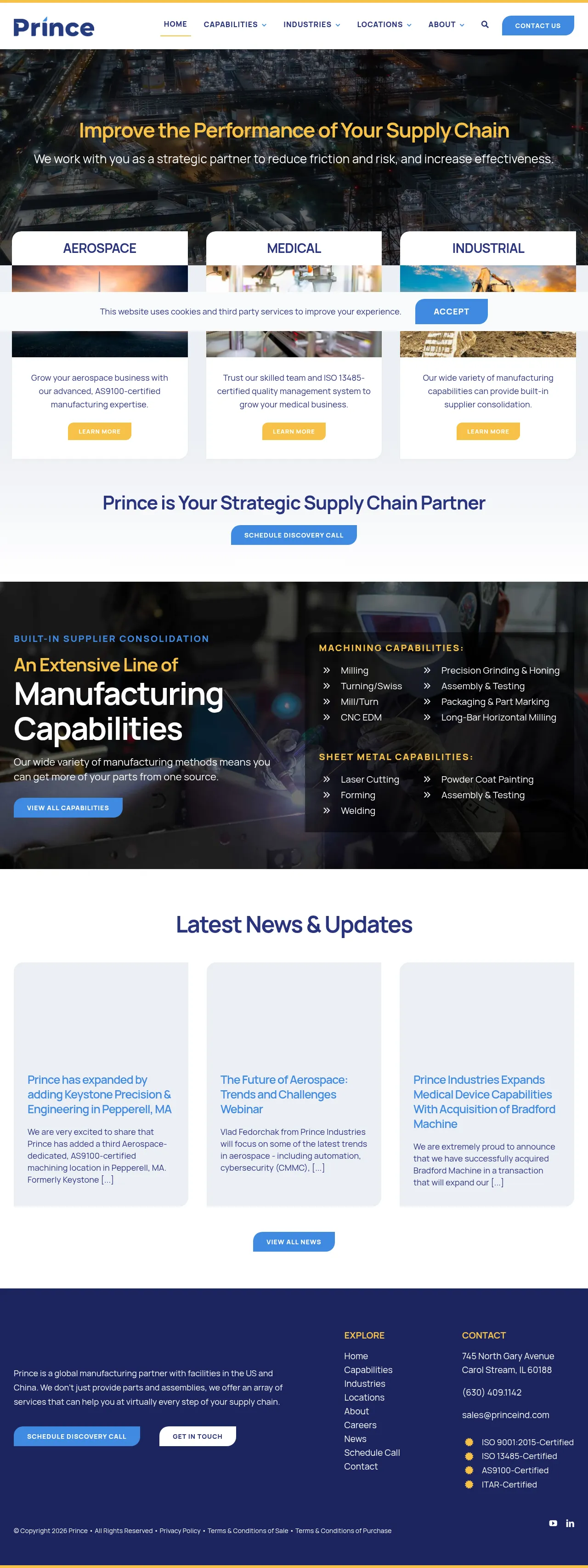Prince is a contract manufacturer with facilities in the United States and China producing precision machined and sheet-metal fabricated components and assemblies. The company provides a range of manufacturing and finishing services across the supply chain, including CNC machining, forming, laser cutting and finishing. Prince supports regulated industries, including medical products, and maintains documented quality systems at multiple sites.