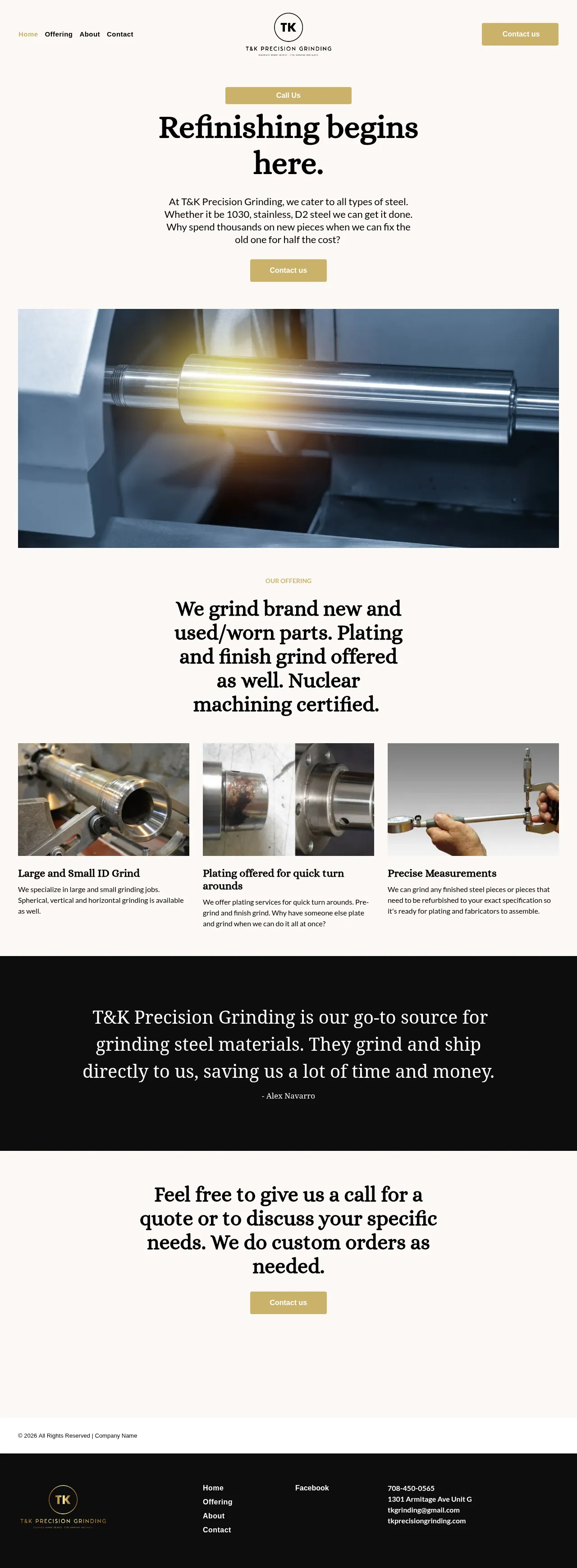 TK Precision Grinding is a family-owned metal processing company specializing in industrial grinding and surface finishing services. With two decades of experience, the company provides comprehensive solutions for large and small steel components, including spherical, vertical, and horizontal grinding. They serve a broad range of sectors such as manufacturing, construction, automotive, and aerospace by offering integrated plating and precision finishing. Their facility is equipped to handle both new production parts and the refurbishment of used components to meet exact specifications. The company emphasizes a client-focused approach, maintaining clear communication and high quality standards for custom fabrication and repair projects.