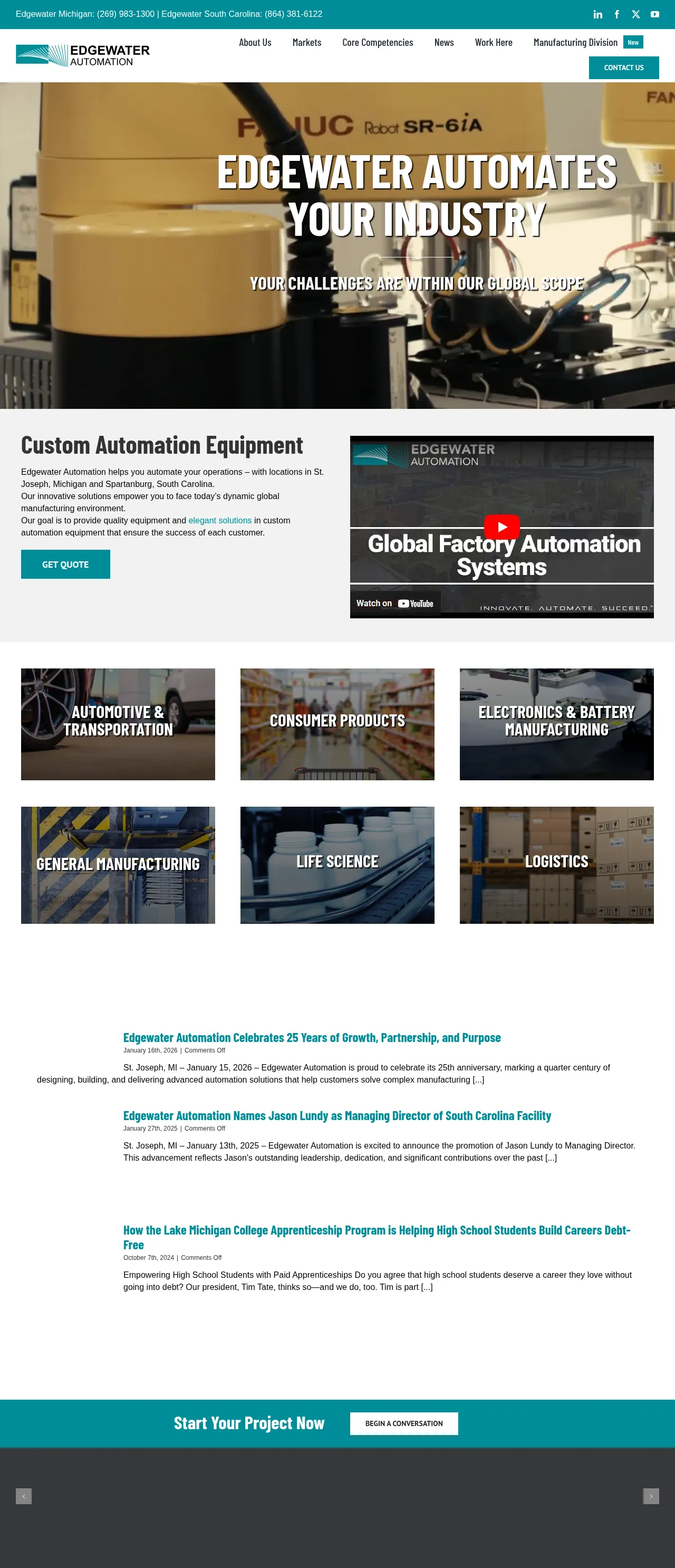 Edgewater Automation is an ISO 9001:2015-certified designer and manufacturer of custom automation equipment, systems, and structures. The company serves diverse industries, including life sciences, automotive, logistics, and consumer packaged goods, providing solutions ranging from robotics and motion control to software management. Their in-house capabilities encompass complete engineering design using 3D CAD, precision metal and plastic fabrication, and contract manufacturing services. With extensive facilities in Michigan and South Carolina, the company supports projects from small-run prototyping to full-scale production. They emphasize collaborative engineering, quick turnaround times, and robust internal quality control to meet the complex requirements of industrial clients.