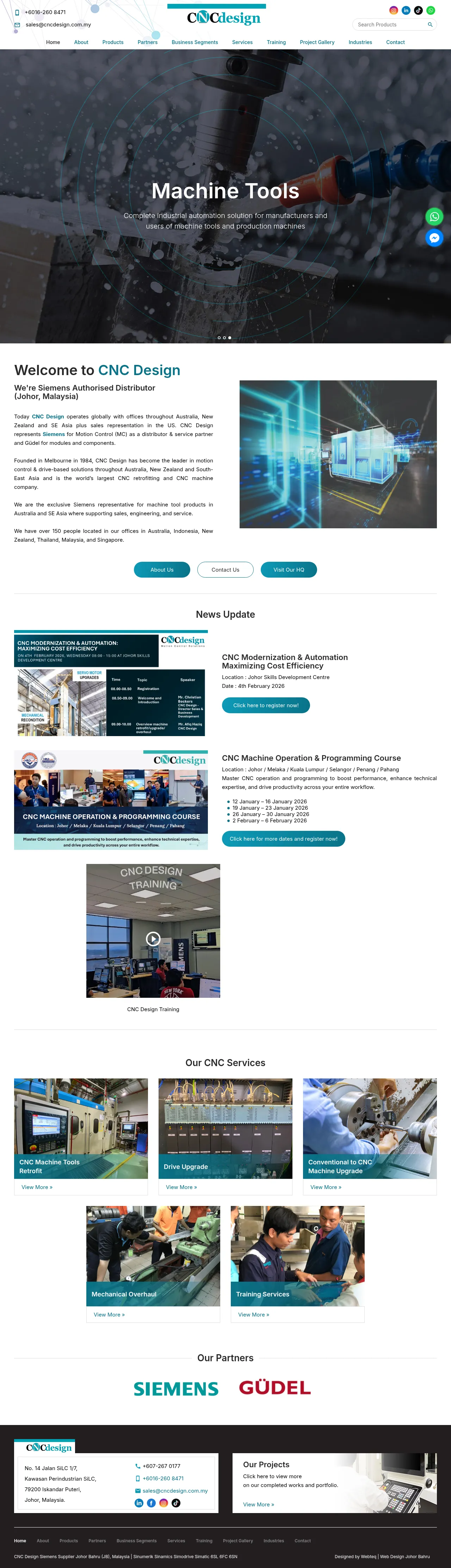 CNC Design is a distributor and service partner specializing in motion control, drive-based solutions and CNC systems across Australia, New Zealand and Southeast Asia, with sales representation in the United States. Founded in Melbourne in 1984, the company provides CNC retrofitting, machine tool sales and automation engineering, and serves as the exclusive Siemens representative for machine tool products in Australia and SE Asia. It also represents Güdel for modules and components and maintains regional offices including a Siemens-authorised distributor location in Johor Bahru, Malaysia.