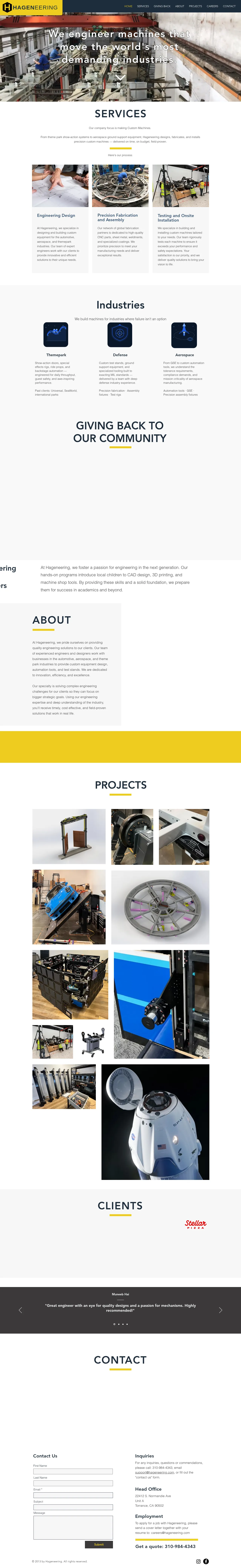 Hageneering is an engineering firm that specializes in the design, fabrication, and installation of custom machinery. The company serves the automotive, aerospace, and theme park industries by providing tailored solutions ranging from electrical power distribution to integrated motion control systems. Their services include comprehensive engineering design, precision assembly, and global onsite installation support. With a focus on innovation and technical excellence, the team manages projects from initial concept through to final testing. Hageneering maintains a strong commitment to quality and safety, ensuring all delivered equipment meets specific client performance standards.