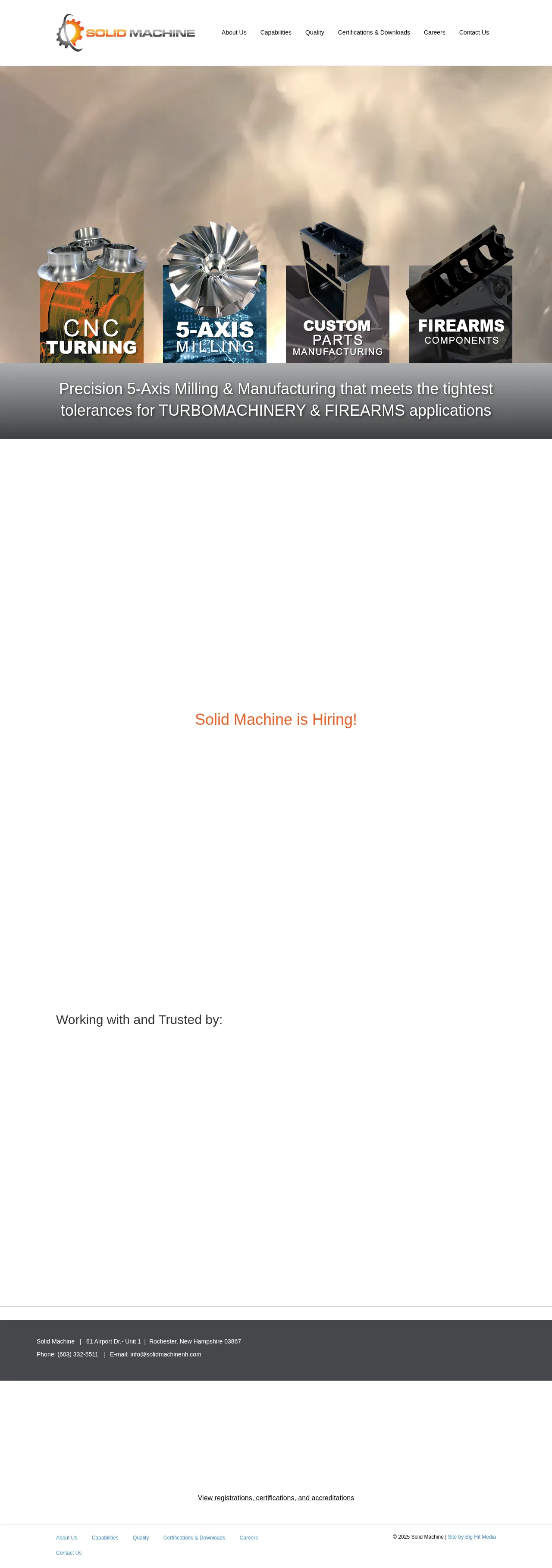 Solid Machine is a precision manufacturer based in Rochester, New Hampshire, specializing in the production of rotating bladed turbomachinery hardware. The company provides high-mix, low-volume prototypes as well as high-volume production for industries including aerospace and automotive. Their core capabilities include simultaneous 5-axis milling, precision CNC turning, and a variety of secondary processes such as heat treatment, plating, and EDM. Solid Machine emphasizes engineering process control and technical perfection to deliver complex components for demanding applications. They utilize advanced software for design and manufacturing and offer inventory management services for just-in-time delivery.