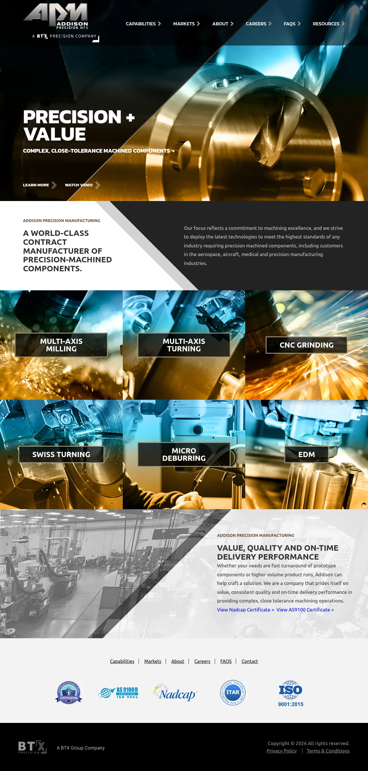 Addison Precision Manufacturing is a contract manufacturer specializing in high-precision, close-tolerance machined components. Established in 1952 in Rochester, New York, the company operates a large-scale facility serving the aerospace, aircraft, defense, and medical industries. Their capabilities encompass multi-axis milling and turning, Swiss machining, CNC grinding, and electrical discharge machining. The organization focuses on technical collaboration and operational excellence, acting as a strategic partner for complex manufacturing requirements. Their facility supports a wide range of production needs, from prototype to high-volume manufacturing.