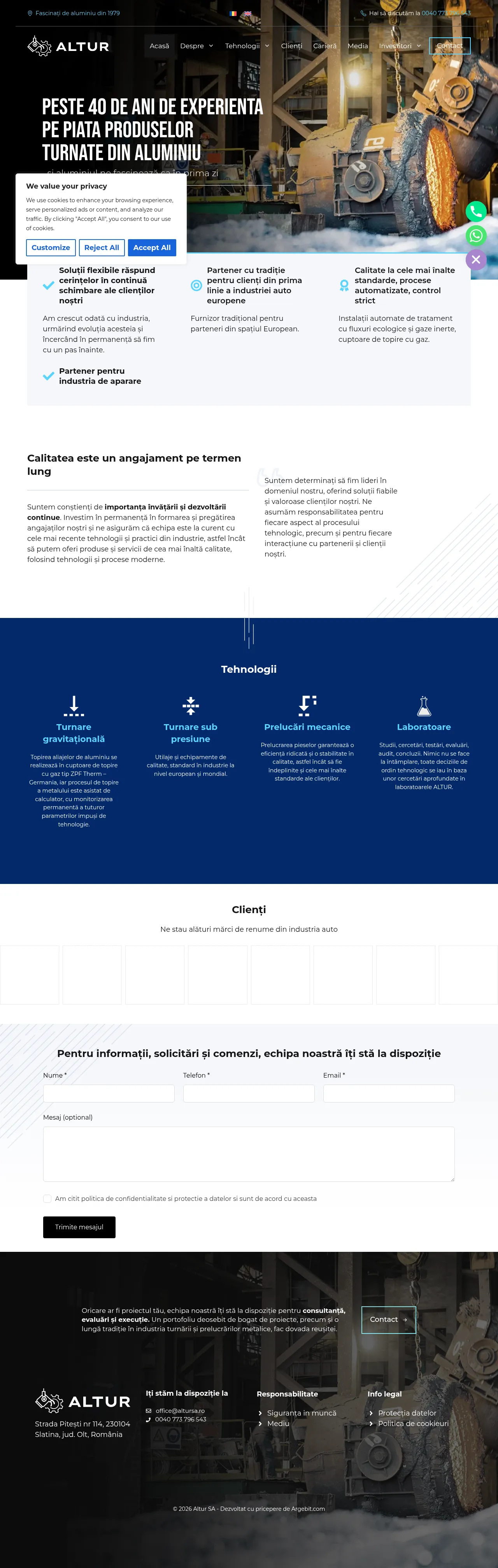 Altur SA is a specialized manufacturing company with over 40 years of experience in the aluminum casting and machining industry. Based in Slatina, Romania, the company serves as a Tier 1 supplier primarily for the European automotive and defense industries. Their core capabilities include gravity and die casting, complemented by advanced computer-assisted mechanical processing. Altur SA emphasizes rigorous quality control and environmental responsibility, maintaining various international management standards throughout its production processes. The company provides integrated solutions ranging from project assessment to final execution for global automotive clients.