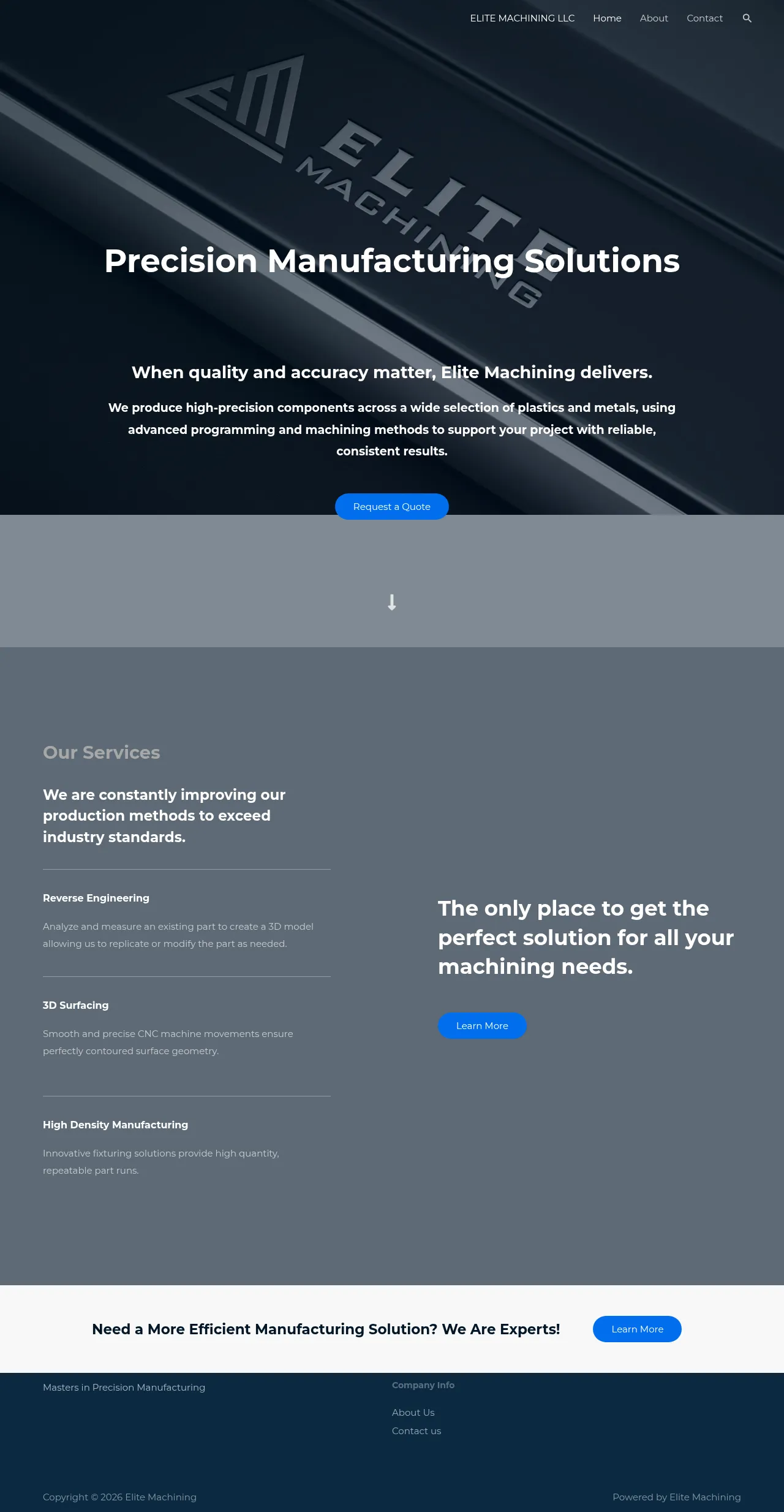 Elite Machining provides professional precision manufacturing and CNC machining services for a variety of metal and plastic components. The company supports clients throughout the entire product lifecycle, offering expertise from initial design and prototyping to full-scale production. Their core capabilities include high-precision vertical milling, tight-tolerance turning, and reverse engineering services. By utilizing advanced 3D modeling and innovative fixturing, they ensure consistent quality and repeatable outcomes for complex geometries. The company is dedicated to meeting rigorous industry standards through continuous improvement and modern machining methods.