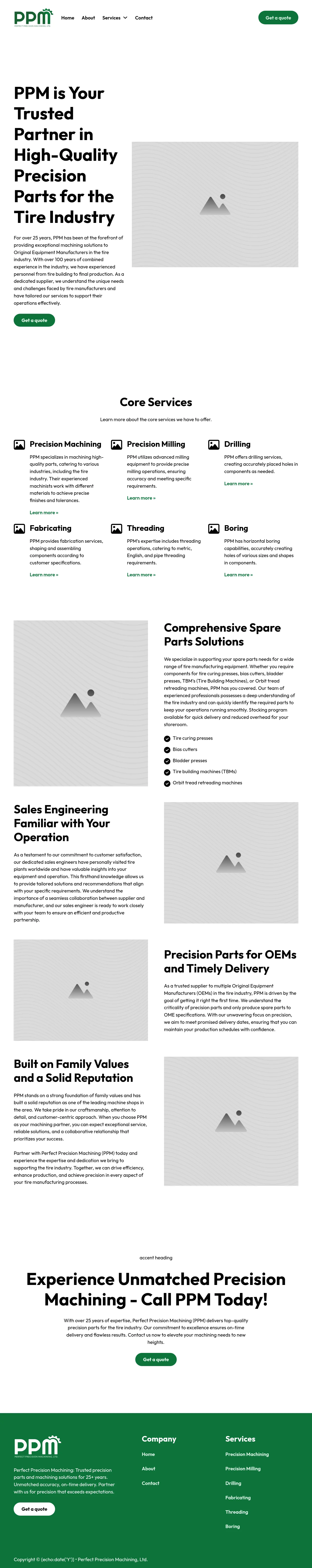 Perfect Precision Machining provides precision machining services with over 25 years of experience. The company specializes in manufacturing spare parts and components for the tire industry, supporting equipment such as curing presses, bias cutters, and tire building machines. Core capabilities include milling, drilling, fabrication, threading, and boring. They serve as a dedicated partner to original equipment manufacturers, emphasizing adherence to strict technical specifications and reliable delivery schedules. Their operations are supported by a sales engineering team that offers firsthand equipment expertise to assist with custom machining requirements.