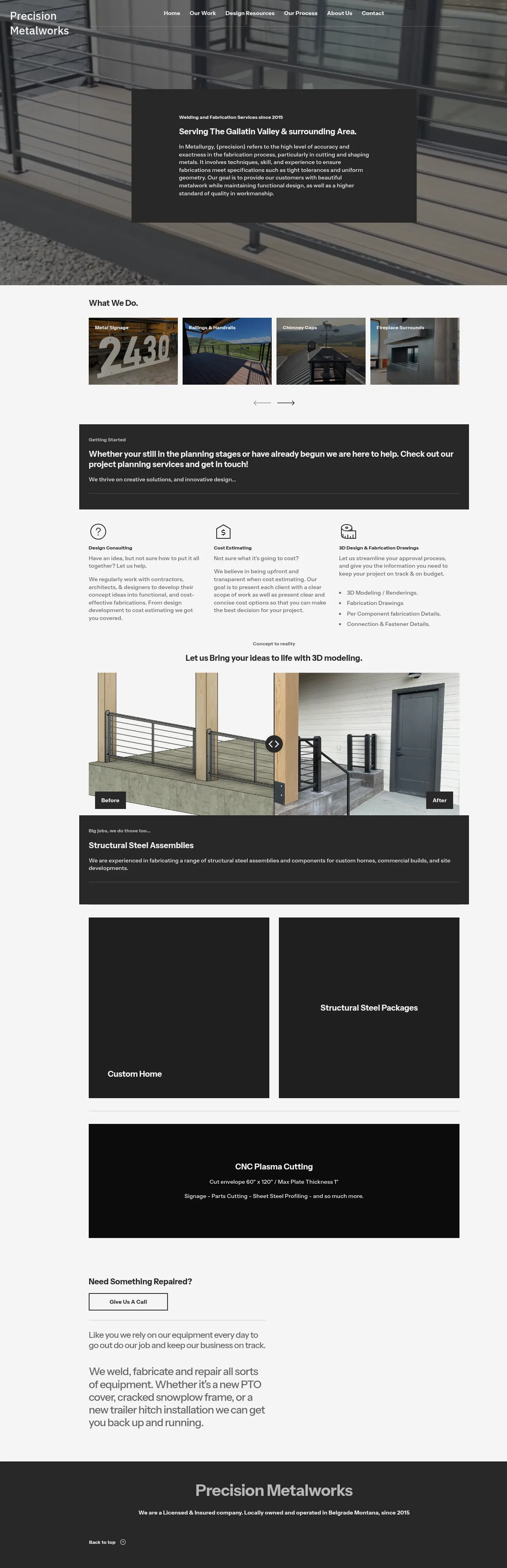 Custom WeldingMetal FabricationEquipment RepairCNC Plasma Cutting3D ModelingDesign ConsultingStructural Steel AssemblyPowder CoatingInstallation Services