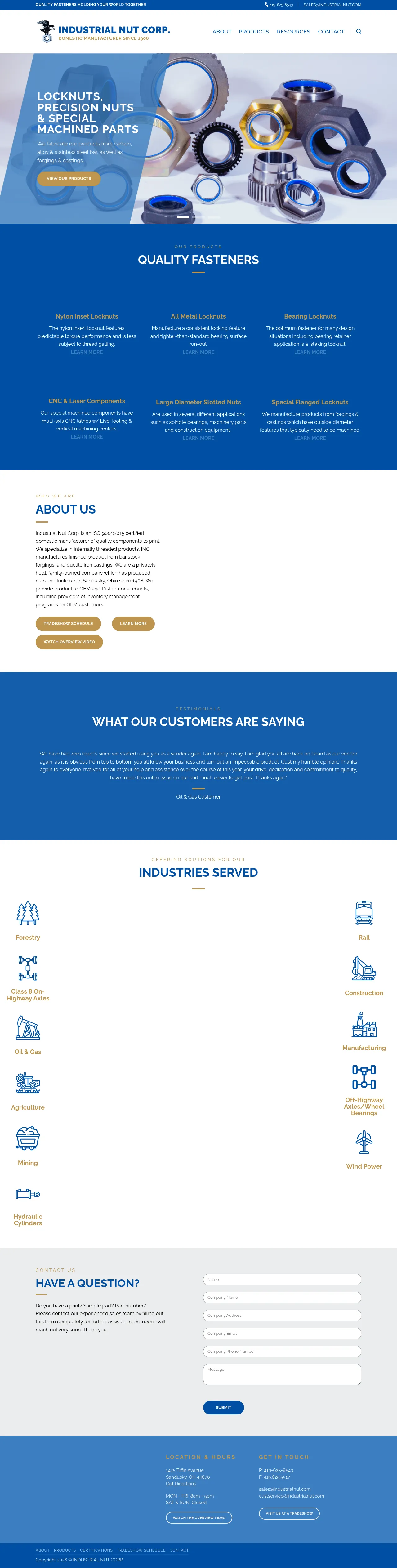 Industrial Nut Corp. is an ISO 9001:2015 certified domestic manufacturer specializing in internally threaded products. Based in Sandusky, Ohio, the family-owned company produces high-quality nuts and locknuts from bar stock, forgings, and ductile iron castings for various OEM and distributor accounts. They serve a wide range of industries, including forestry, agriculture, mining, rail, wind power, and heavy-duty transportation. The company is recognized for its commitment to precision, quality control, and problem-solving in critical fastener applications.