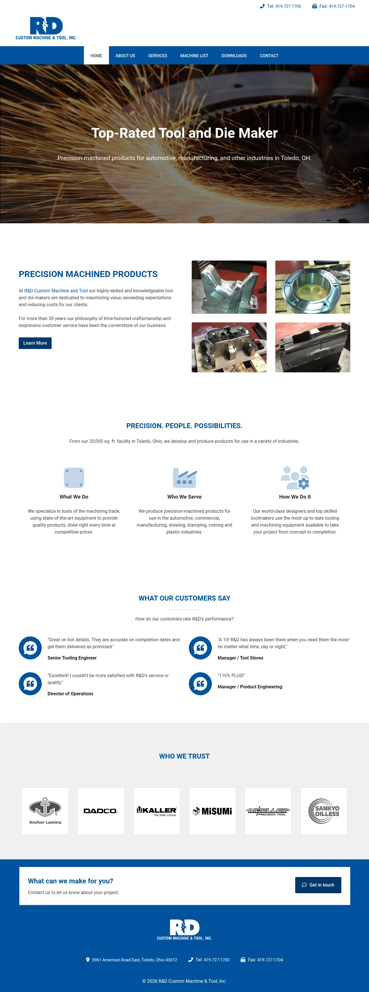 RD Custom Machine is a precision manufacturing facility based in Toledo, Ohio, offering a comprehensive suite of machining and die construction services. The company specializes in high-performance CNC machining, stamping dies, and intricate tool making for the automotive, commercial, and plastic manufacturing industries. Utilizing advanced technologies such as 3D scanning, reverse engineering, and EDM processes, they support projects from conceptual design through to final production. Their 20,000 square-foot facility provides full-service tooling capabilities, including trial stamping for production validation. The company is committed to high-accuracy engineering, serving diverse industrial needs with a focus on quality and timely delivery.