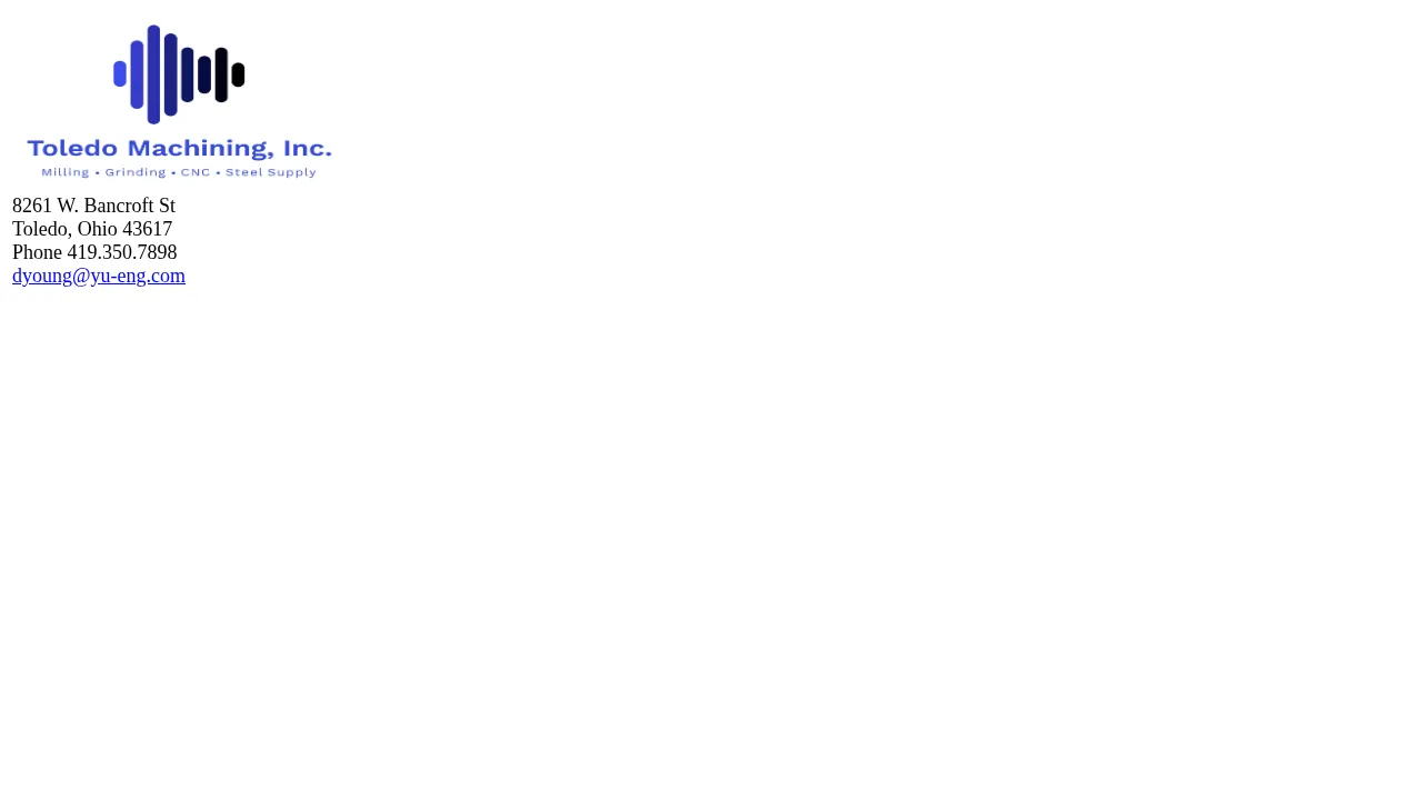 8261 W Bancroft St, Toledo, OH 43617, USA, Toledo, Ohio, United States(419) 343-7738dyoung@yu-eng.comhttp://toledomachining.com/