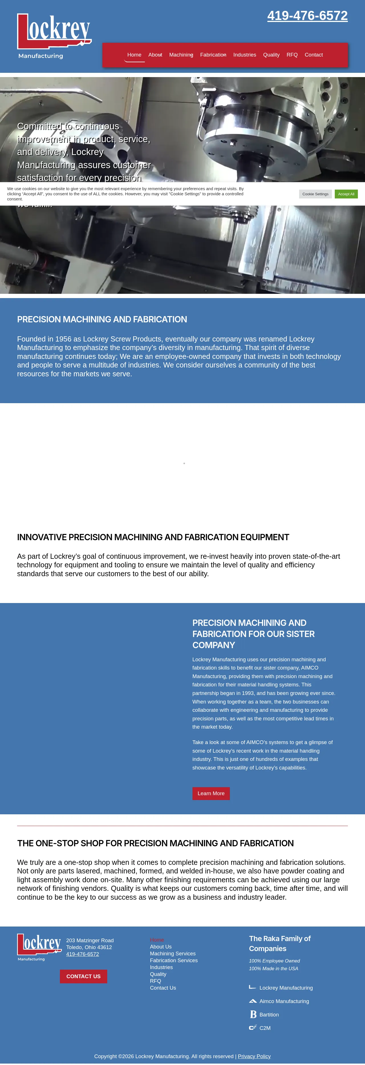 Lockrey Manufacturing is an employee-owned facility specializing in comprehensive precision machining and fabrication services. The company serves a diverse range of sectors, including aerospace, defense, energy, medical, and agriculture, providing solutions from prototype development to mid-sized production runs. Its capabilities encompass CNC machining, laser cutting, welding, and powder coating, supported by an on-site quality assurance lab. By utilizing an integrated industrial approach, Lockrey offers turn-key manufacturing that emphasizes efficiency, quality control, and reduced lead times. The firm is dedicated to continuous technological investment and maintains rigorous standards to support global industry requirements.