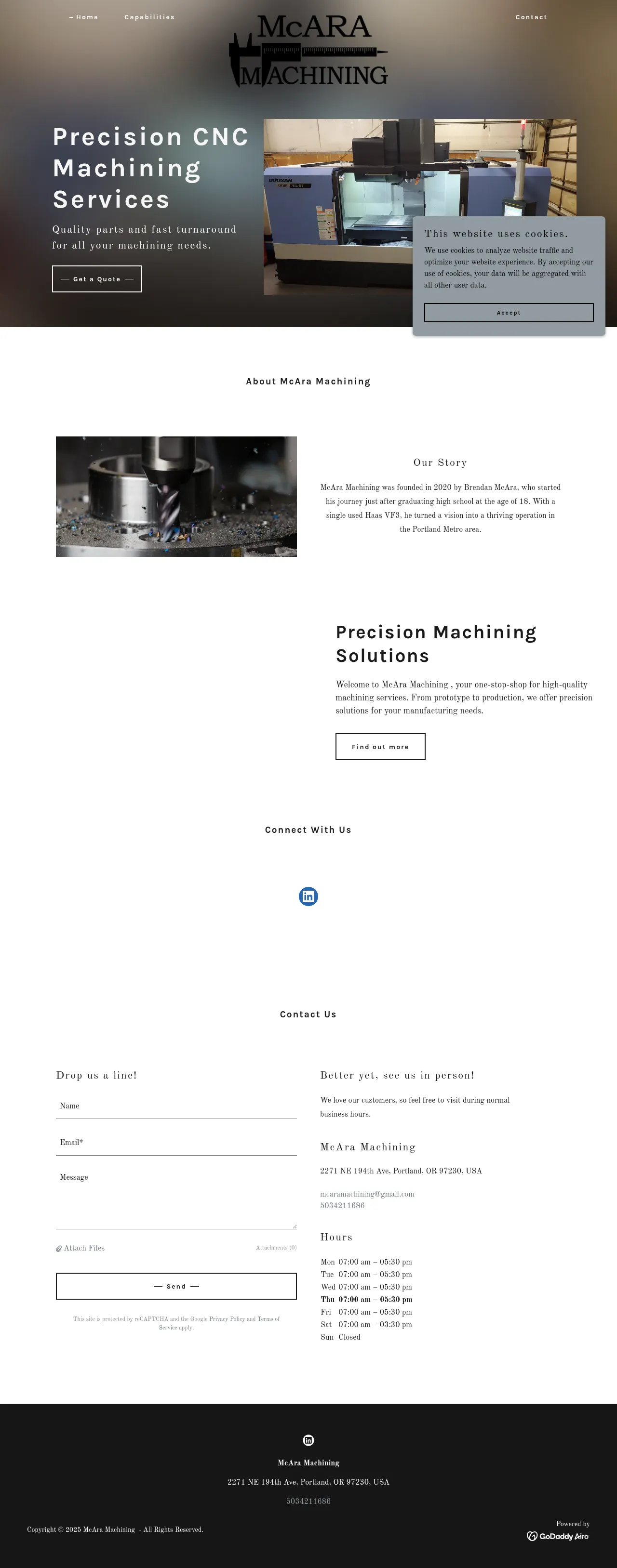 McAra Machining is a precision manufacturing company located in the Portland Metro area. Established in 2020, the firm specializes in CNC machining services ranging from initial prototyping to full-scale production runs. The company focuses on delivering high-quality machined components with expedited turnaround times to meet diverse client requirements. By maintaining a centralized operation in Oregon, they provide localized manufacturing support for a variety of industrial applications. The business operates with a commitment to precision engineering and responsive customer service.