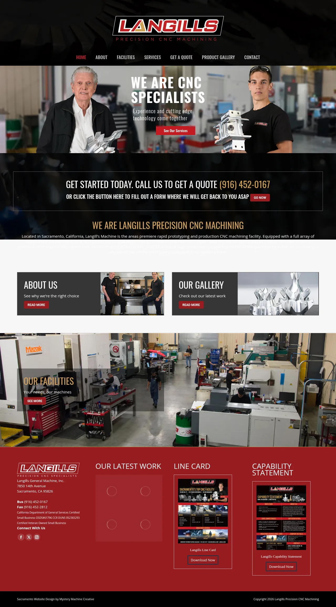 Langills Precision CNC Machining is a Sacramento, California CNC facility specializing in rapid prototyping and production machining. The company operates an 18,000+ sq ft shop with multiple CNC platforms including 5-axis, mill-turn, and multi-pallet systems for high-volume work. Services include CNC programming, CAD/CAM support, and production machining with ISO9000 quality compliance. The business was founded in 1969.