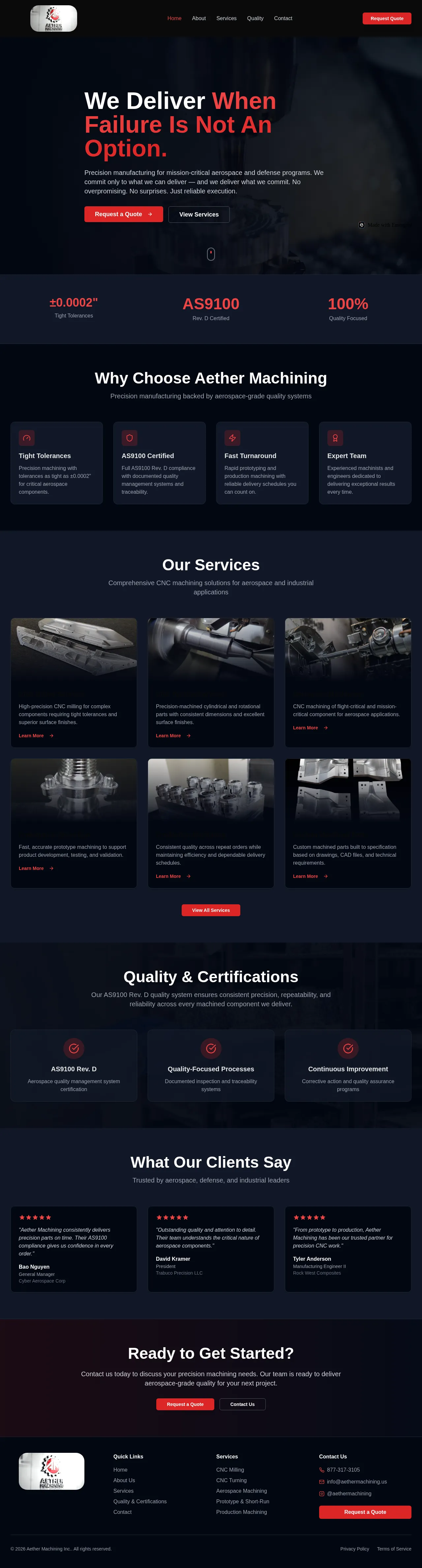 Aether Machining provides precision CNC manufacturing and inspection services for aerospace, defense, and industrial applications. The company specializes in multi-axis milling and turning of mission- and flight-critical components, supporting prototypes through production runs. In-process and final inspections, including CMM and surface-finish analysis, are integrated into their quality workflow. Their quality system follows AS9100 Rev. D and ISO 9001 standards to maintain repeatability and traceability.